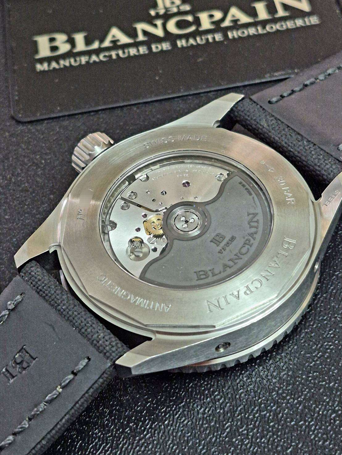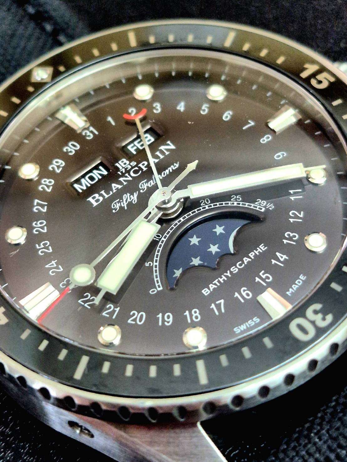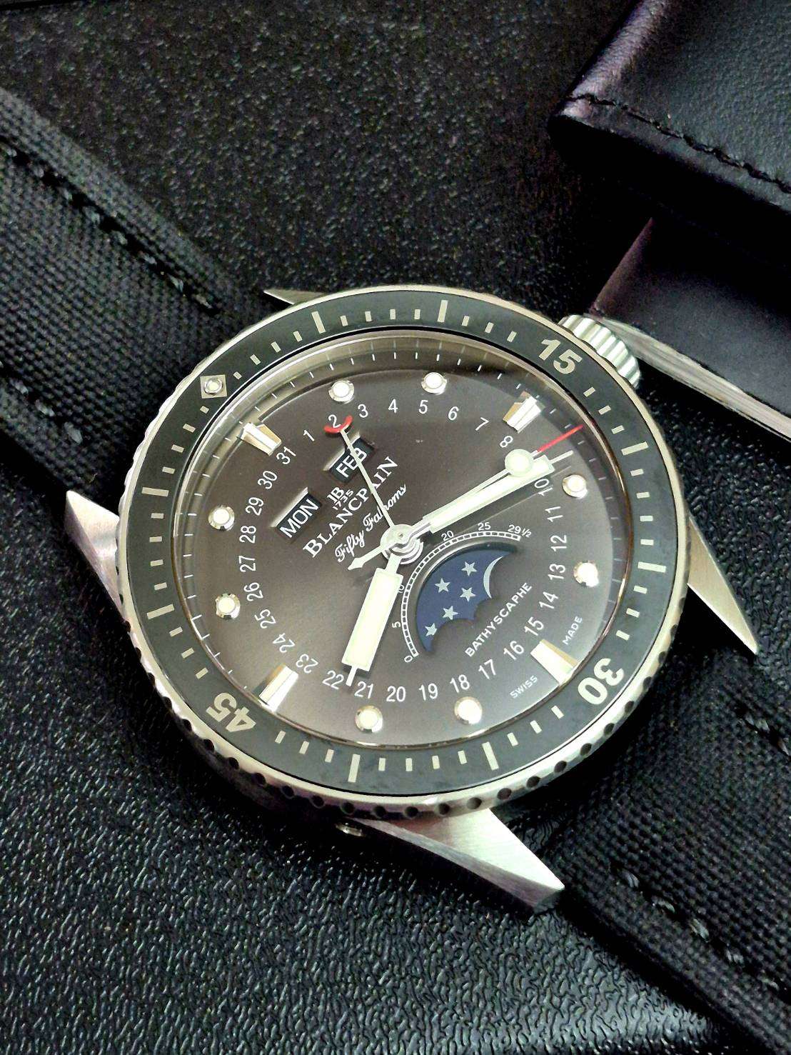⌚Blancpain Fifty Fathoms Bathyscaphe, Quantième Complete Calendar Phase de Lune+. Ref.5054-1110-B52A เรือนเวลาดำน้ำลึกจากค่ายขนมปังขาว ทำงานด้วยกลไกอัตโนมัติ In House movement Caliber 6654.P สำรองพลังงาน 72 ชั่วโมง แสดงฟังก์ชั่นบอกเวลา และ ปฏิทินฐาวร พร้อม Moonphase ข้างขึ้นข้างแรม ในตัวเรือน Stainless steel ขนาด 43 mm สภาพสวยงามมากๆ กล่องดำน้ำนอก, ในใบยักษ์พร้อมใบประกันครบๆ ราคาเวปต่างประเทศเกือบ5แสนบาท