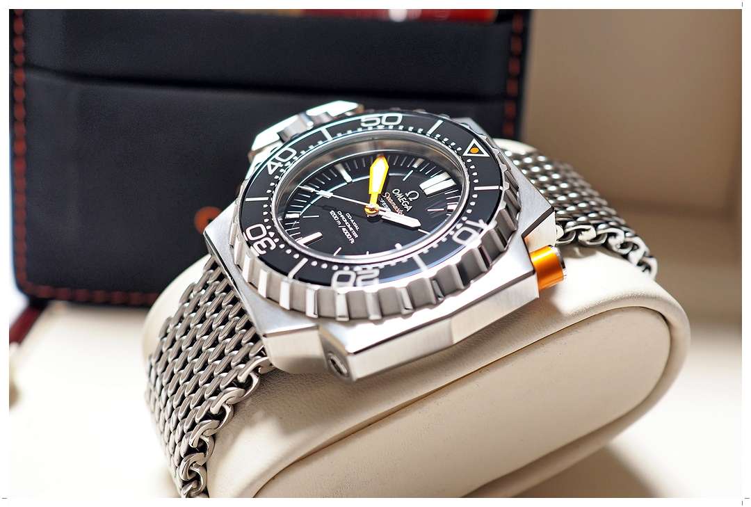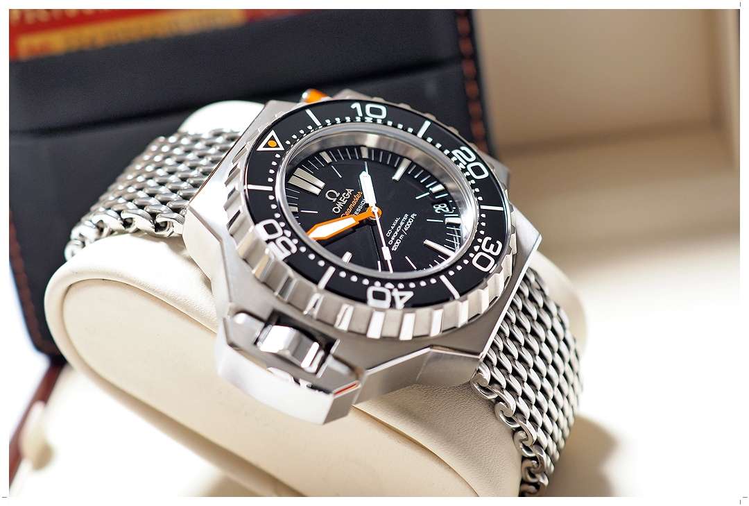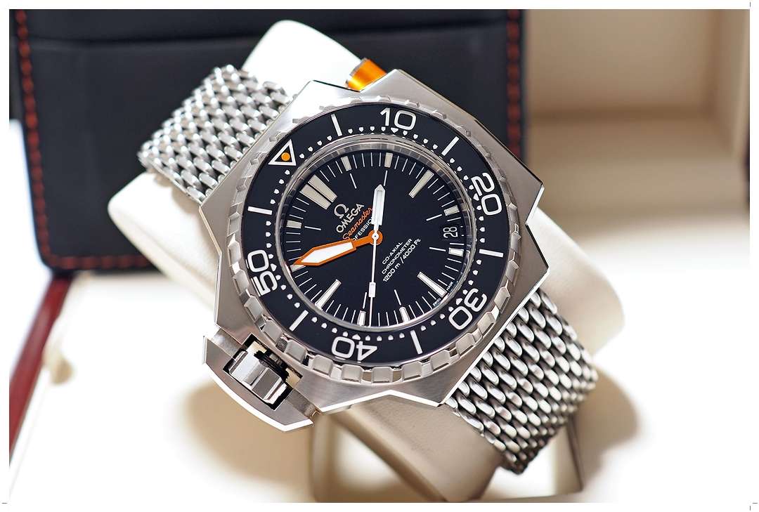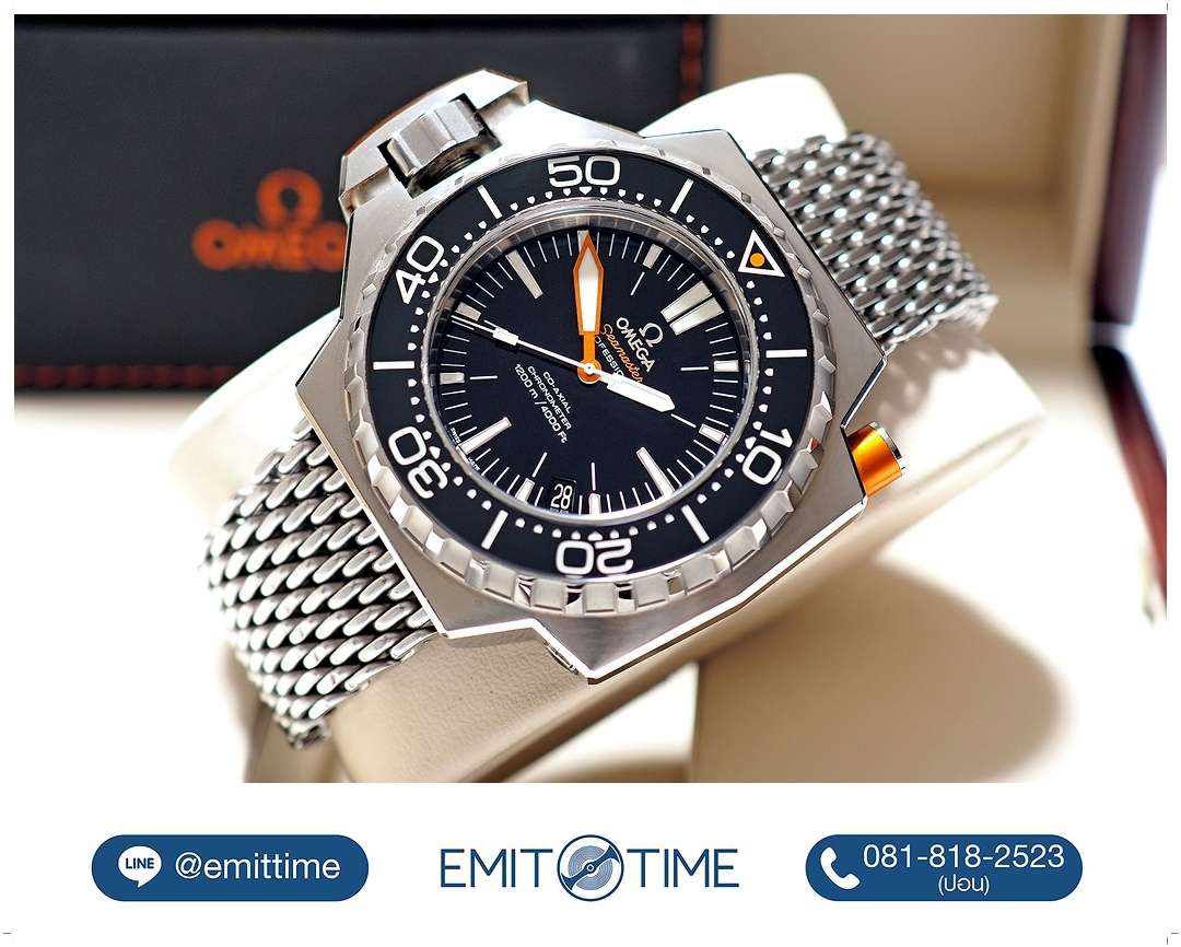 ตำนานดำน้ำลึกรุ่นใหญ่สุดของ Omega “Ploprof” 1200m เรือนนี้มาด้วยตัวเรือนขนาด 55mm x 48mm (Lug-to-Lug) ใส่แล้วไม่ล้นข้อ ขึ้นข้อกำลังสวย ขอบเบเซลทำจากวัสดุ Black Sapphire ทนทานต่อรอยขีดข่วน หมุนได้แบบ Bi-Directional มาพร้อม Safety-Lock ด้วยการกดแกน Pusher สีส้มเพื่อปรับหมุน หน้าต่างวันที่วางได้อย่างสวยงามที่ตำแหน่ง 4.5 นาฬิกา เม็ดมะยมขันเกลียวพร้อม Crown-Guard ที่จดลิขสิทธิ์ของ Ploprof โดยเฉพาะ วางตำแหน่งมะยมแบบขับซ้ายเพื่อความสะดวกในการสวมใส่ หน้าปัดและขอบ Bezel สีดำดุดันสุดขีด เข้ากับสาย Mesh Sharkproof ได้อย่างลงตัว บัคเคิ่ลมีระบบ Extension ซ่อนใต้บานพับใช้งานง่ายดายมาก ราคา Price List สุดท้ายสูงถึง 389,000 บาท EMITTIME เสนอราคา Rare Item เรือนนี้ในราคาต่ำป้ายเกือบ 60% ครับ