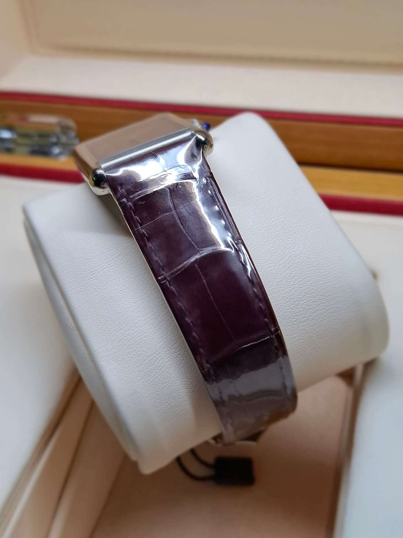 ขนาด 33.7 x 25.5 มิล, หน้าปัดเคลือบแลคเกอร์สีม่วงแดง, เข็มนาฬิกาทรงดาบทำจากสตีลขัดเงา, ระบบ Quartz, เม็ดมะยมทรงกลมประดับสปิเนลสังเคราะห์ทรงคาโบชง, สายหนังจระเข้สีม่วงแดง, บัคเคิ้ลสตีลแบบหัวเข็มขัด, กันน้ำ 30 เมตร