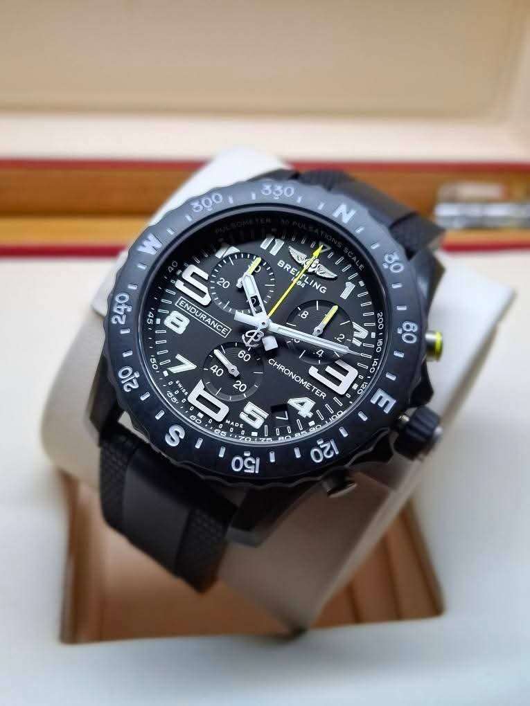 ขนาด 44 มิล, หน้าปัดสีดำ หลักเวลาเลขอารบิกอ่านเวลาได้ง่าย ชุดเข็มจับเวลาสีเหลืองโดดเด่นสวยงาม โดยนาฬิการุ่นนี้นั้นถูกออกแบบมาพิเศษผลิตจาก Breitlight® โดยมีน้ำหนักเบามากกว่าไทเทเนียม 3.3 เท่า และ 5.8 เท่า เมื่อเทียบกับสแตนเลสสตีล ตัวเครื่อง Breitling’s Caliber 82 COSC ระบบ SuperQuartz™ ชั้นสูง ซึ่งมีอัตราความแม่นยำในการเดินมากกว่าระบบควอทซ์มาตรฐานถึง 10 เท่า มาพร้อมฟังค์ชั่นจับเวลา Chronograph, มีช่องแสดงวันที่ Date, นาฬิกาเดินตรงแม่นยำระดับ COSC Chronometre ขอบสเกลจับเวลาหมุนได้, กันน้ำลึก100 เมตร, กระจกแซฟไฟร์กันรอยเคลือบสารป้องกันแสงสะท้อน มาพร้อมสาย Rubber สีดำสวยงาม