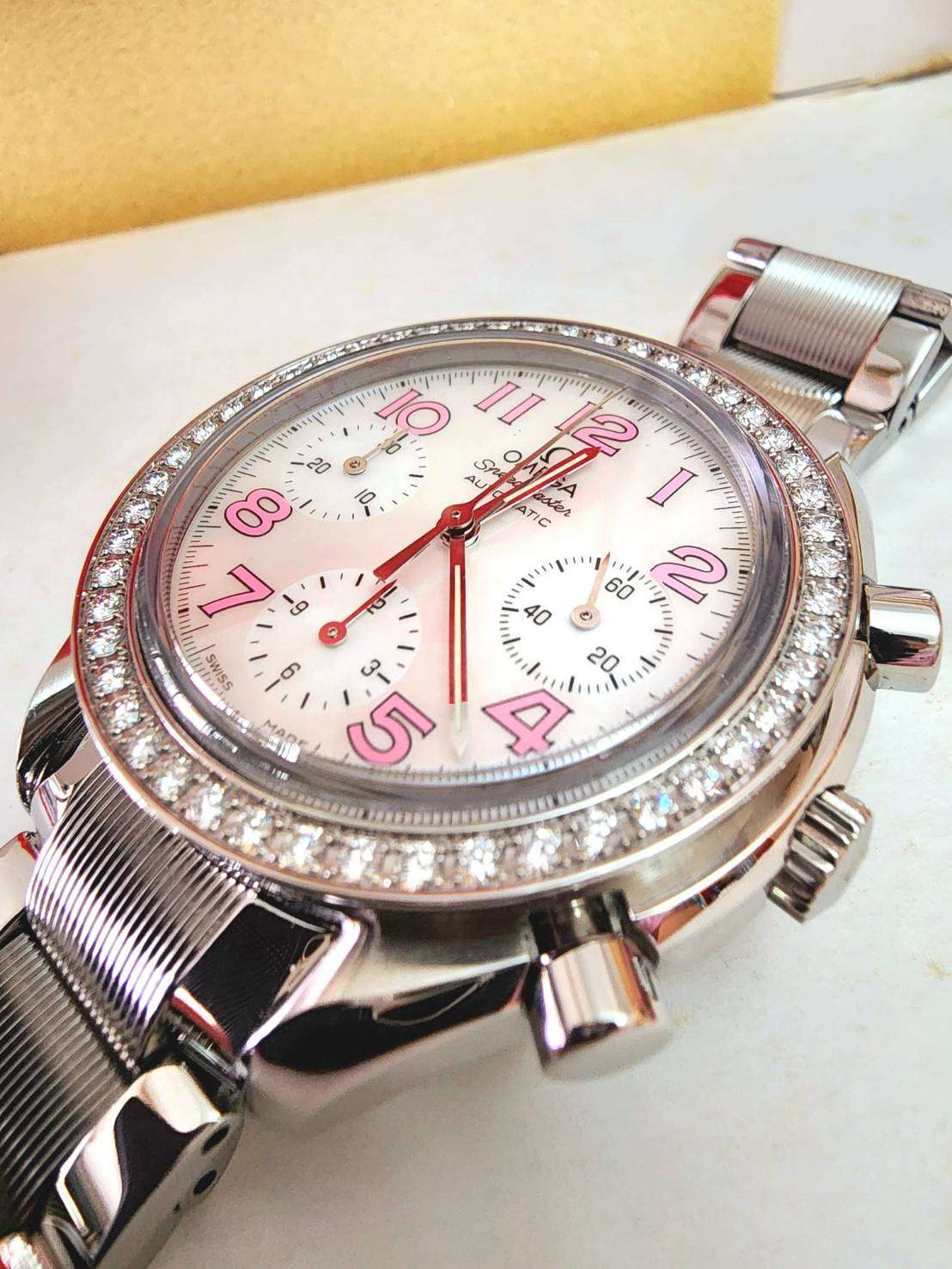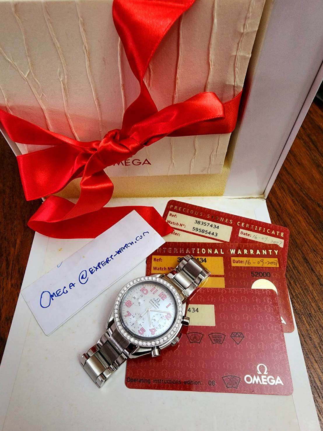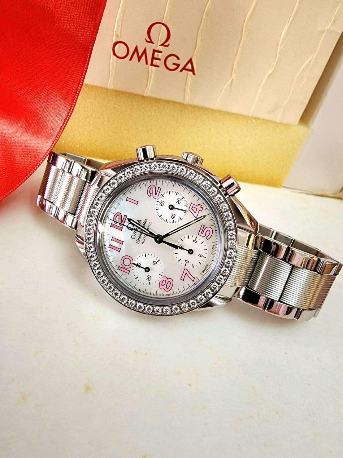 ⌚ Omega​ Speedmaster​ Reduce​ Automatic​Chronograph​ 38mm MOP dial wt Diamonds basel. จับเวลาหน้ามุกชมพู ขอบเพชรน้ำงาม 49 เม็ด น้ำหนัก 1 กะรัต สายเหล็ก กล่อง, นอก/ใน, คู่มือ, ใบประกัน​เรือน, ใบประกันเครื่อง, ใบประกัน​เพชร ครบ3ใบ ราคาดี๊ดี