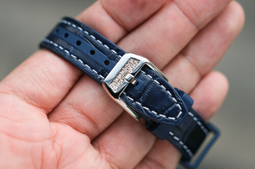 ✨ ขนาด 35mm. หน้าปัด Blue Yachting สีน้ำเงินแกะลายเข็มทิศ เพื่อแสดงถึงการเดินทางบนผืนสมุทร หลักชั่วโมงฝังเพชรสวยมากๆ ตัวเรือน Steel ฝังเพชร After Setting ทั้งเรือน ระยิบระยับสุดๆ มาพร้อมสายยางที่บุหนังจระเข้สีน้ำเงินเดินด้ายขาว รุ่นใหม่ หลังเปลือยเห็นกลไก Automatic ด้วยครับ