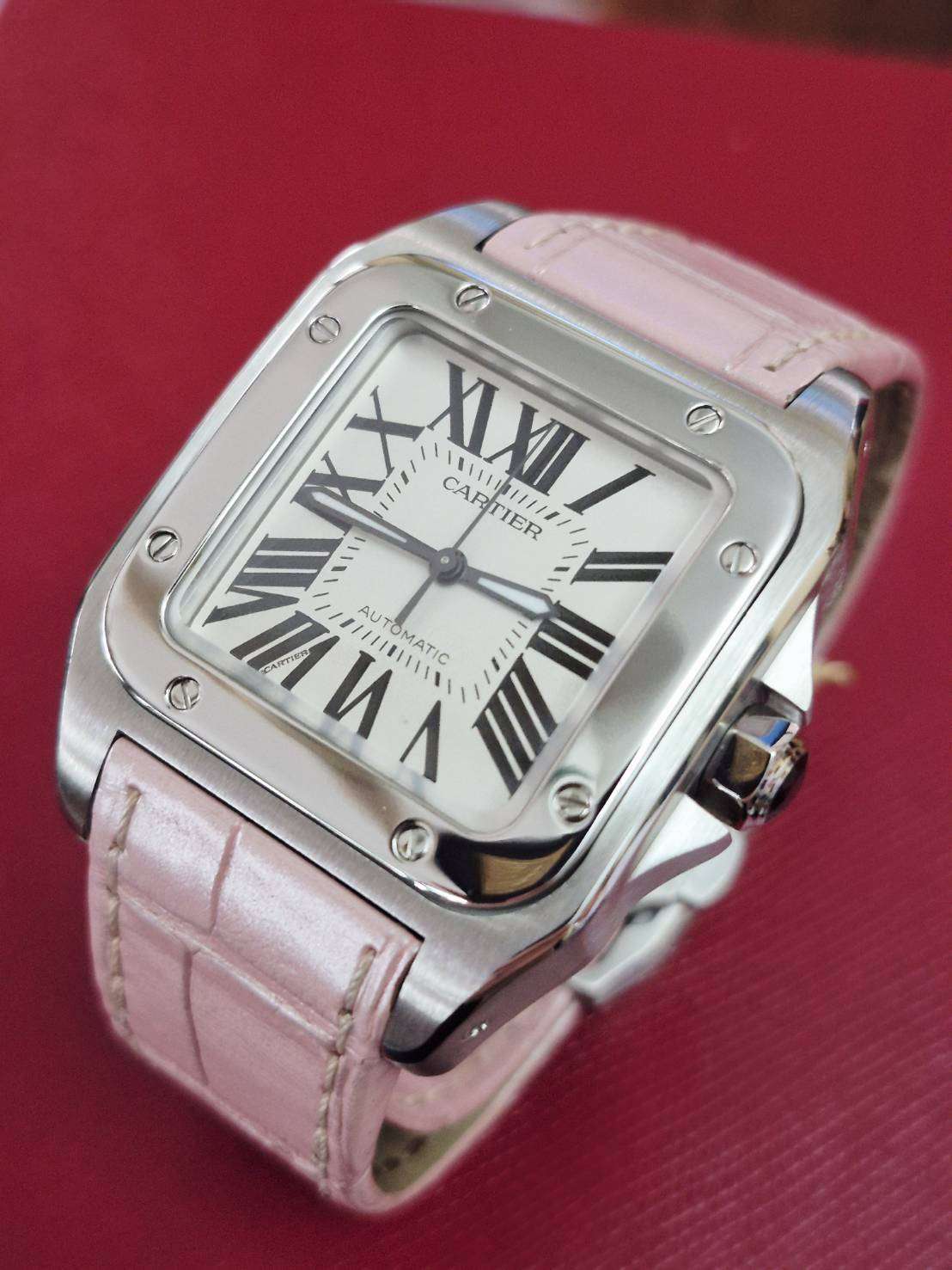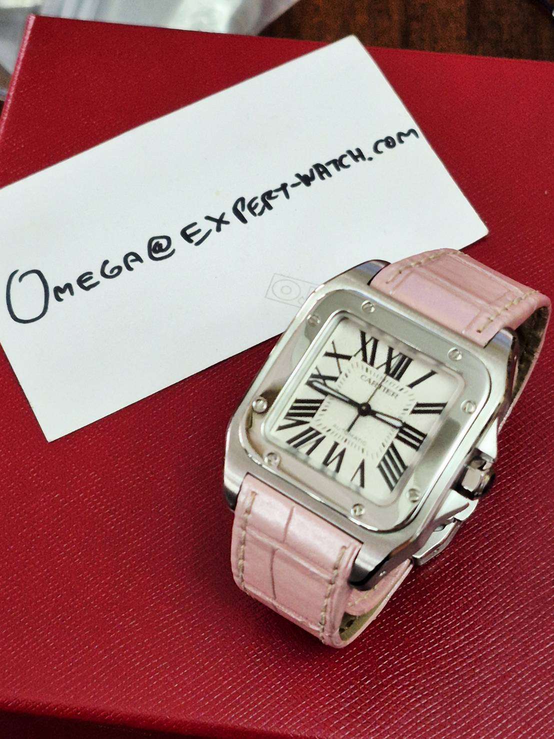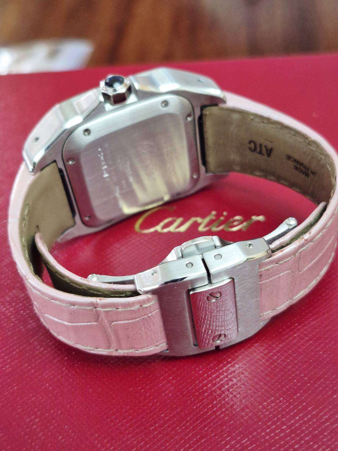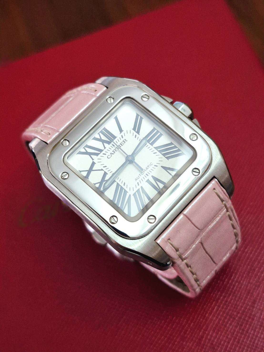 ⌚Cartier Santos 100 MM Lady size Automatic สภาพสวยงาม สายเดิมสีชมพูยังสวยงาม discontinued model Watch only หายาก ราคาดี