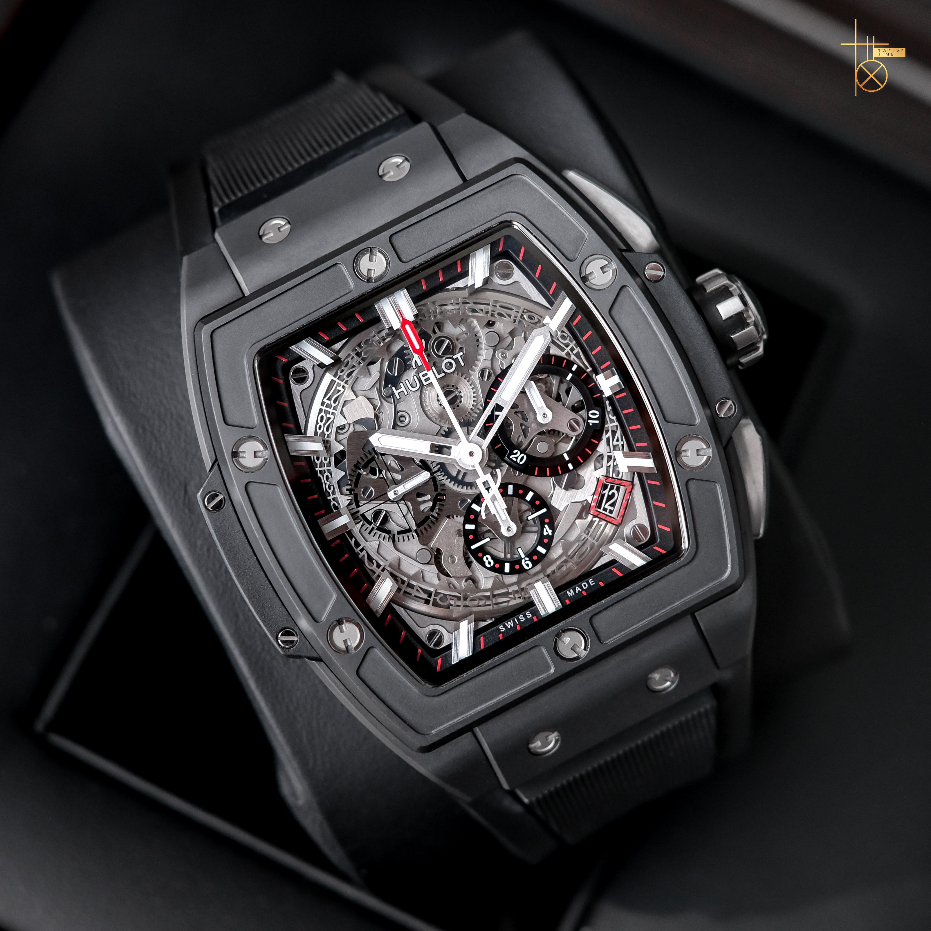 วัสดุทำมาจาก Black Ceramic ทั้งเรือนดูหล่อดุดัน ตัวเรือนขนาด42mm. พอดีข้อ หน้าSkeleton ดูมีมิติ มีช่องบอกวันที่