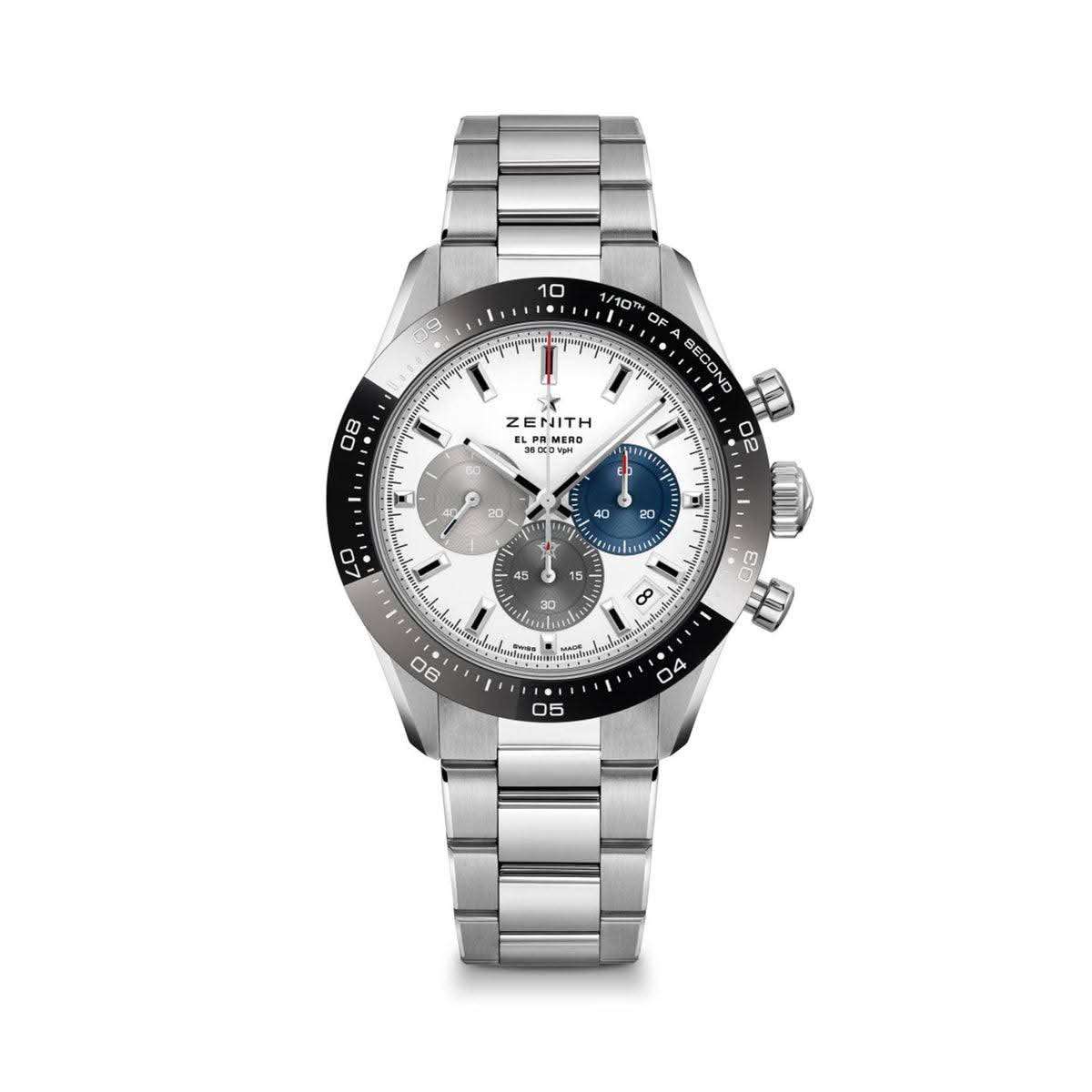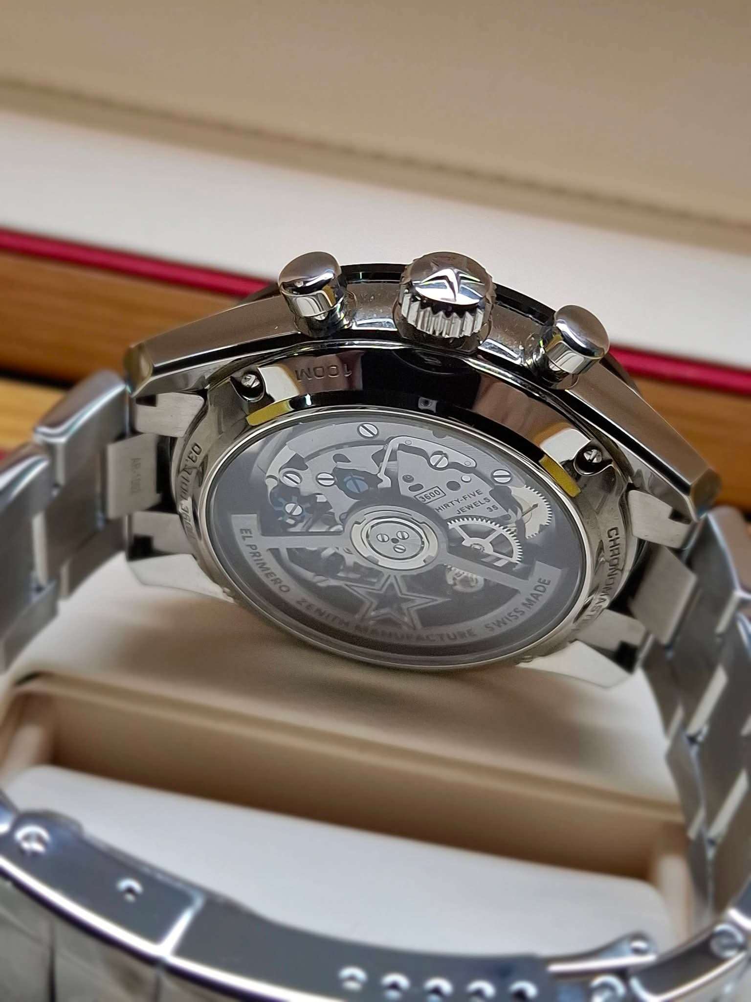 ขนาด 41 มิลใส่เข้าข้อหล่อๆ, หน้าปัดสีขาว ตัดด้วย Tri-Color Subdials 3 สีโดดเด่นสวยงาม, ขอบบาเซลเซรามิคสีดำ (Black Ceramic), กลไก Automatic El Primero, มีฟังก์ชั่นจับเวลา Chronograph, กระจกซัฟไฟร์กันรอย, หลังเปลือยโชว์เครื่องสวยงาม, มีช่องแสดงวันที่