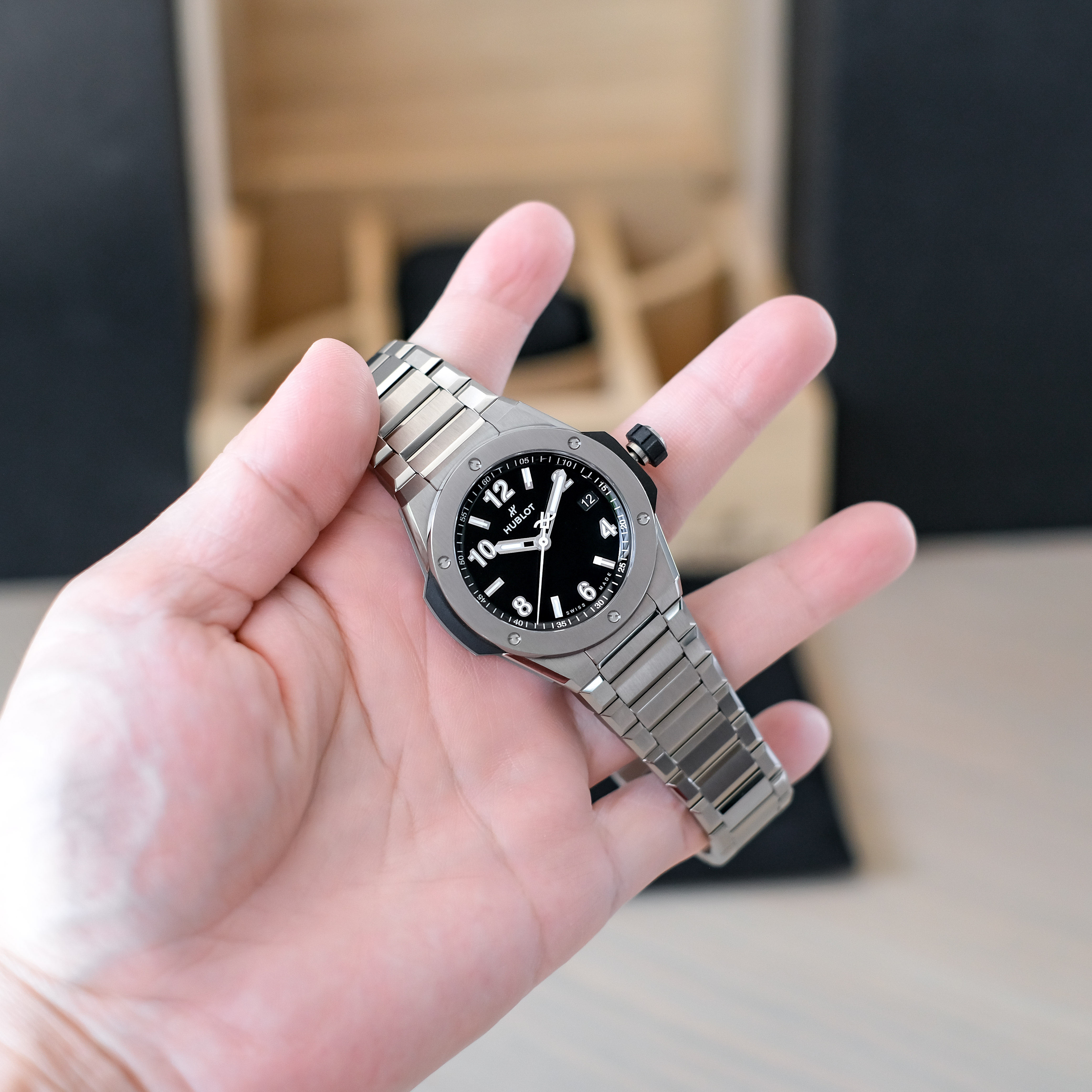 ตัวเรือนขนาด38mm. พอดีข้อมือไม่ล้น วัสดุ Titanium เบาสบายข้อ หน้าปัดดำหลักอารบิค มีช่องบอกวันที่ เครื่องAutomatic