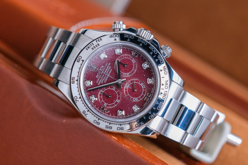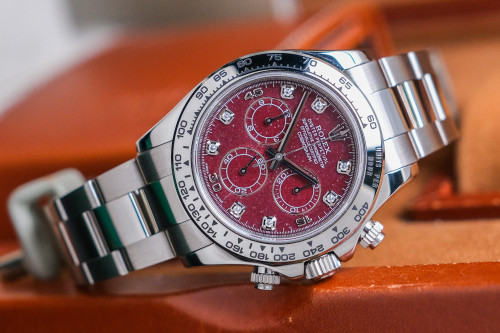ขนาด 40 มม. หน้าปัด Rubelite Dial. หินสีแดงเลือด เข้มๆ ลายสวย หายากสุดๆ หลักฝังเพชร ให้ลุค Sport Luxury ตัวเรือน Full 18k White Gold ไม่มีริ้วรอยหนัก เก็บไว้มีอนาคต ฟังก์ชันจับเวลานุ่มมือมากๆครับ บอกเลยว่าหน้าปัดนี้สวยมากๆ และหายากมากๆเช่นกันครับ