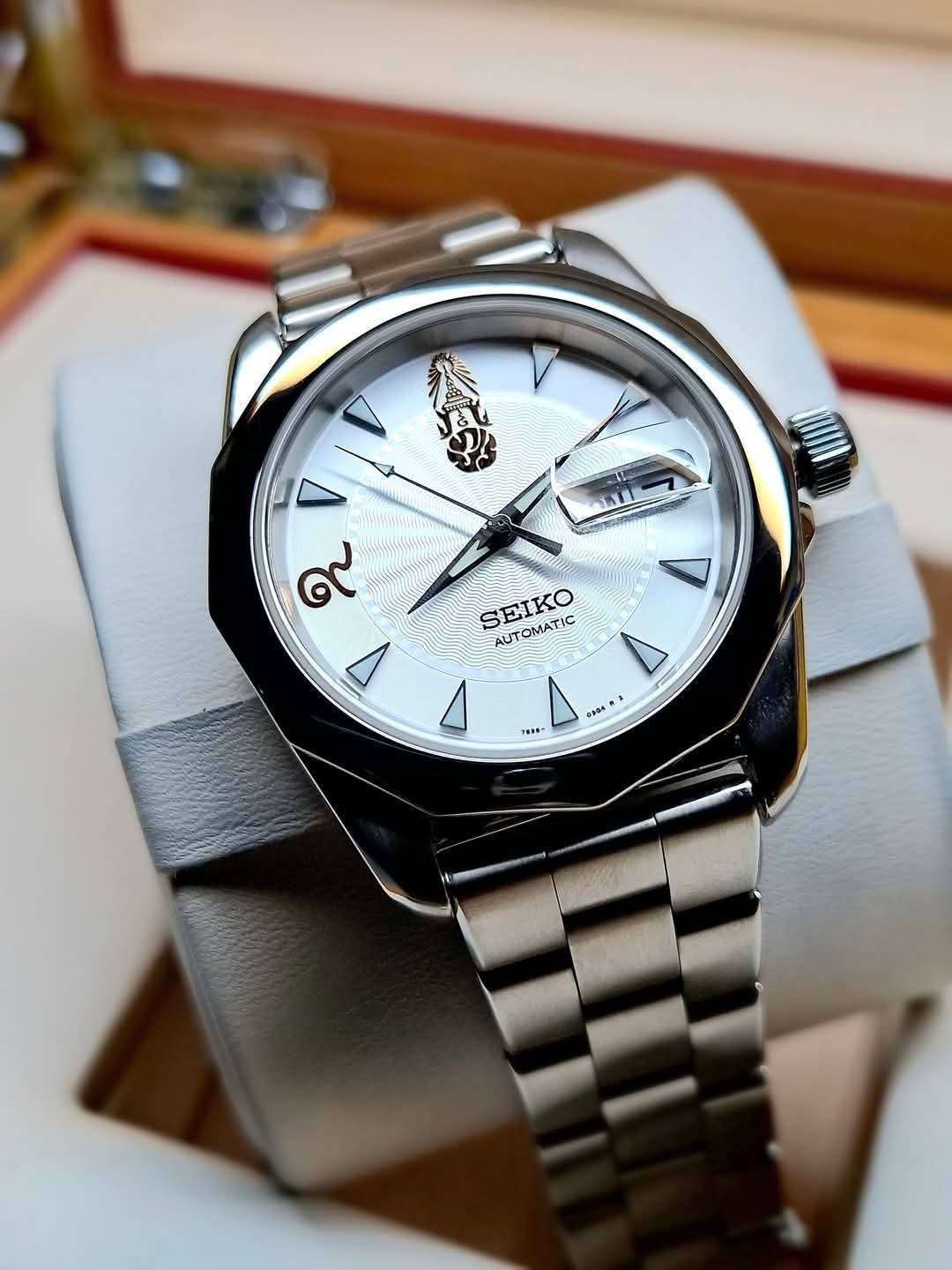 ขนาด 37 มิล, หน้าปัดอัญเชิญตราประจำพระองค์สีทอง ประดับที่ตำแหน่ง 12 นาฬิกา และเลข ๙ ไทยที่ตำแหน่ง 9 นาฬิกา, ตัวเรือนและสายทำจากไทเทเนียม, ระบบ Automatic Cal.7S36, หลังเปลือยโชว์เครื่องสวยงาม พร้อมพิมพ์ตราครองราชย์ 60 ปี, ฝาหลังมีระบุเลขเรือนลิมิเต็ด