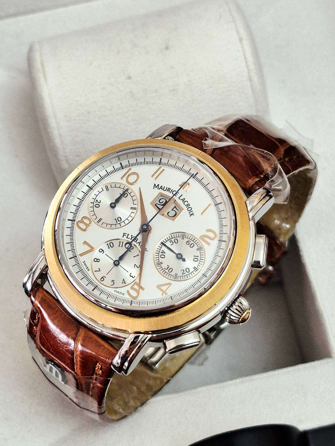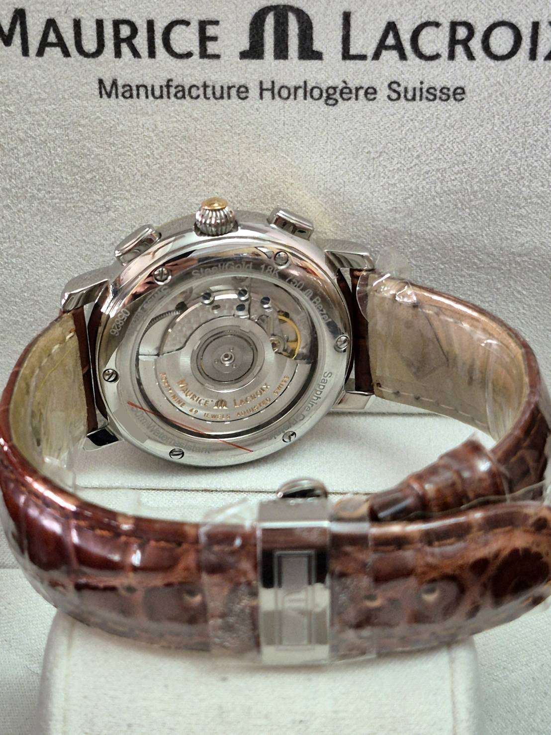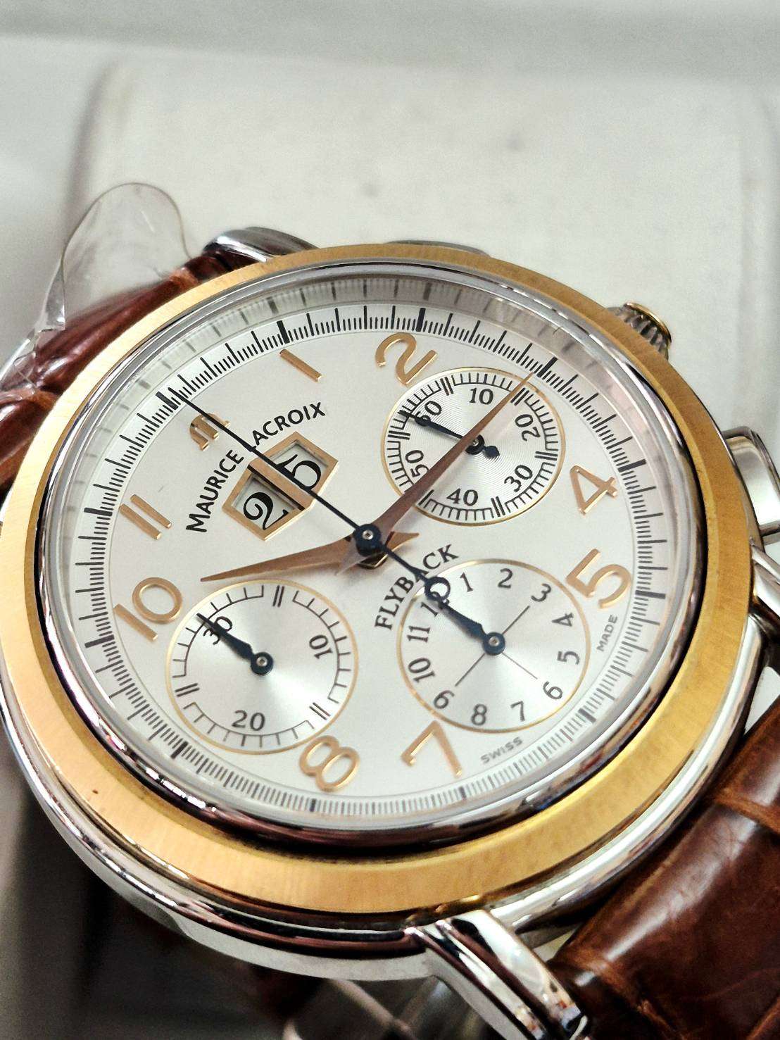 ⌚Maurice Lacroix Masterpiece AutomaticChronograph FLYBack, Bigdate 2 กษัตริย์ เรือนสตีล ขนาด 40 mm ขอบเรือนผลิตจากทองคำแท้ๆ 18K หนาๆ สภาพสวยงามมากเหมือนใหม่ สายหนัง Alligator แท้เดิมๆ(มีเฉพาะใน Masterpiece รุ่นก่อนๆ) หายากมากๆ watch only.