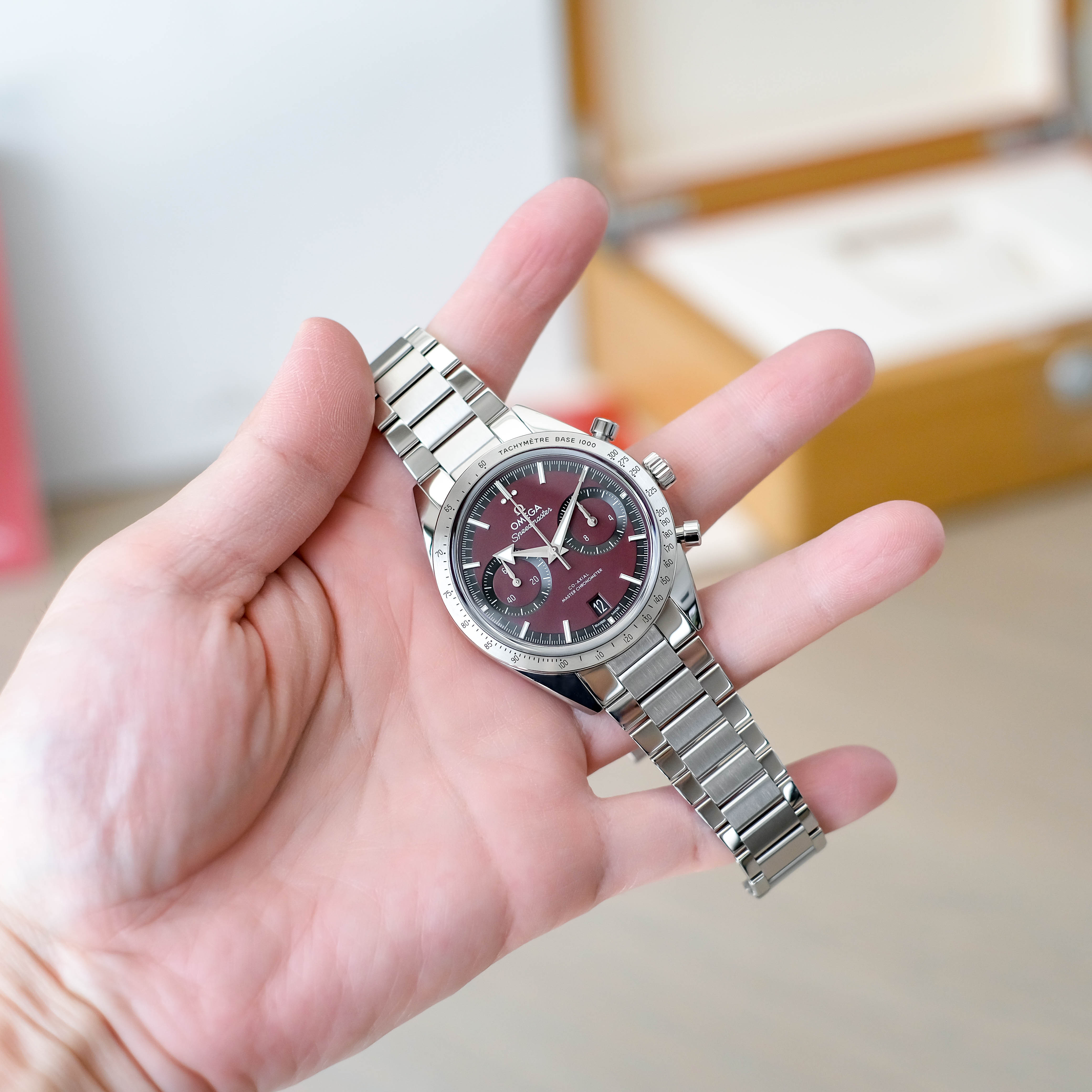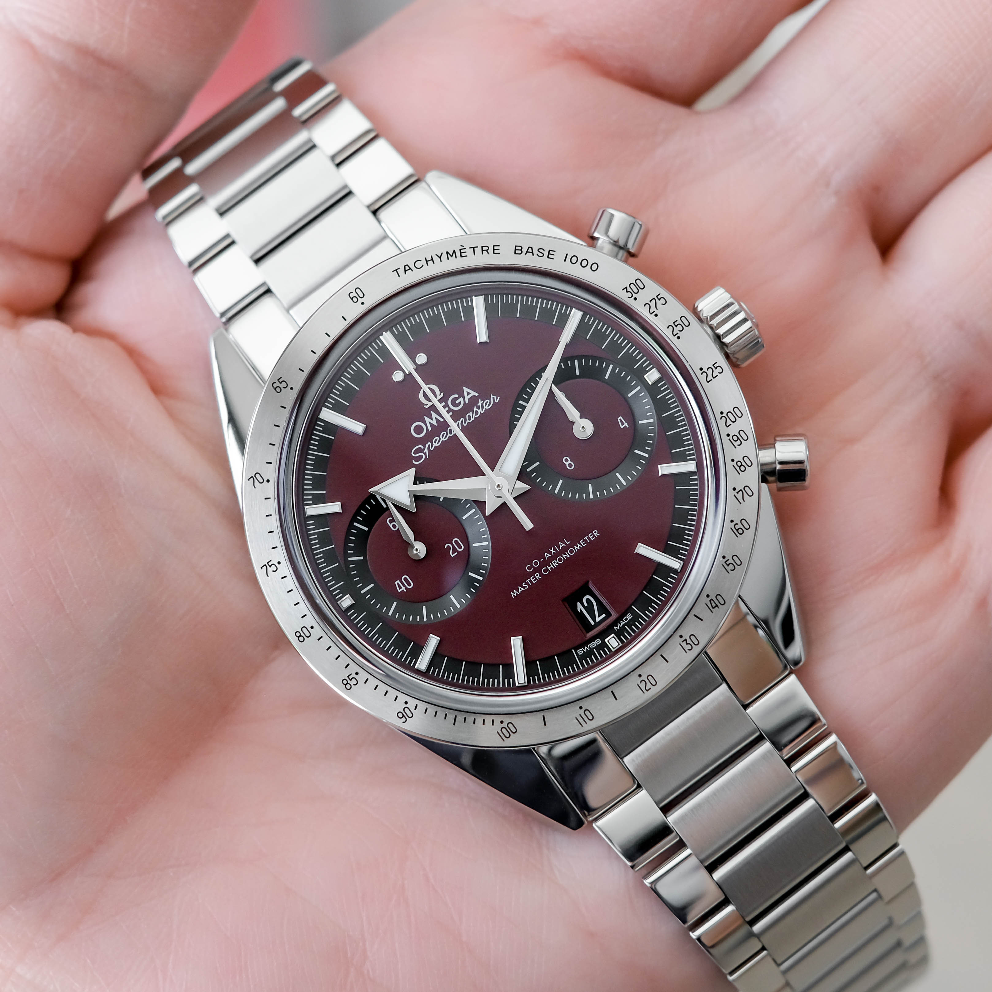 ตัวเรือนขนาด40.5mm. ขึ้นข้อสุดๆ หน้าปัดสีไวน์แดงที่ดูเร่าร้อน เข็มBroad Arrow สุดเฟี้ยว มีChronographจับเวลาและช่องบอกวันที่