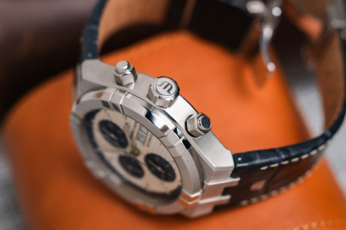 ✨ ขนาด 44 mm หน้าปัดสีเงินแกะลาย “Clous de Paris” ตัดกับ sub-dial สีน้ำเงิน Navy Blue ให้คอนทราสต์ที่ลงตัวสุดๆ พร้อมฟังก์ชัน Chronograph + Day Date ที่ตำแหน่ง 3 นาฬิกา กระจก Sapphire Crystal กันรอยทุกมุม เครื่อง Automatic ML112 เดินนิ่งเที่ยงตรง ใส่กับสายหนังจระเข้สี Navy พร้อมระบบเปลี่ยนสายแบบ Quick Change