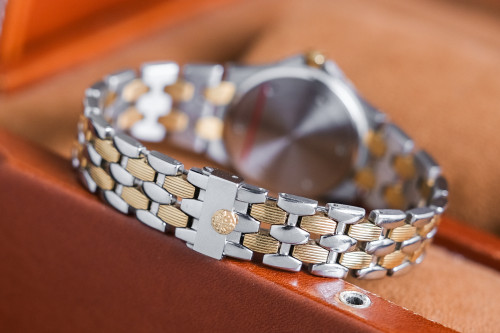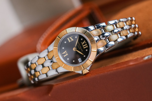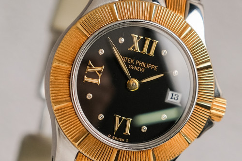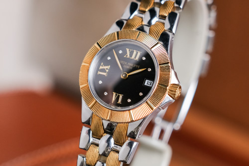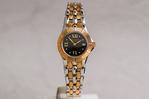 ขนาด 26.5 mm หน้าปัด Black Dial หลักเพชร พร้อมช่องวันที่ ขอบทองคำแกะลาย ตัวเรือน 2 กษัตริย์ ขอบและสายทองคำ ดีไซน์เป็นเอกลักษณ์ไม่เหมือน PP เรือนไหน เป็นรุ่น Vintage หายากมากๆ เครื่อง Quartz