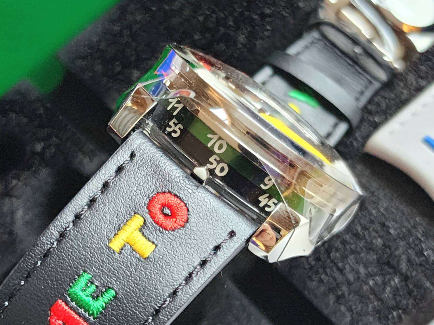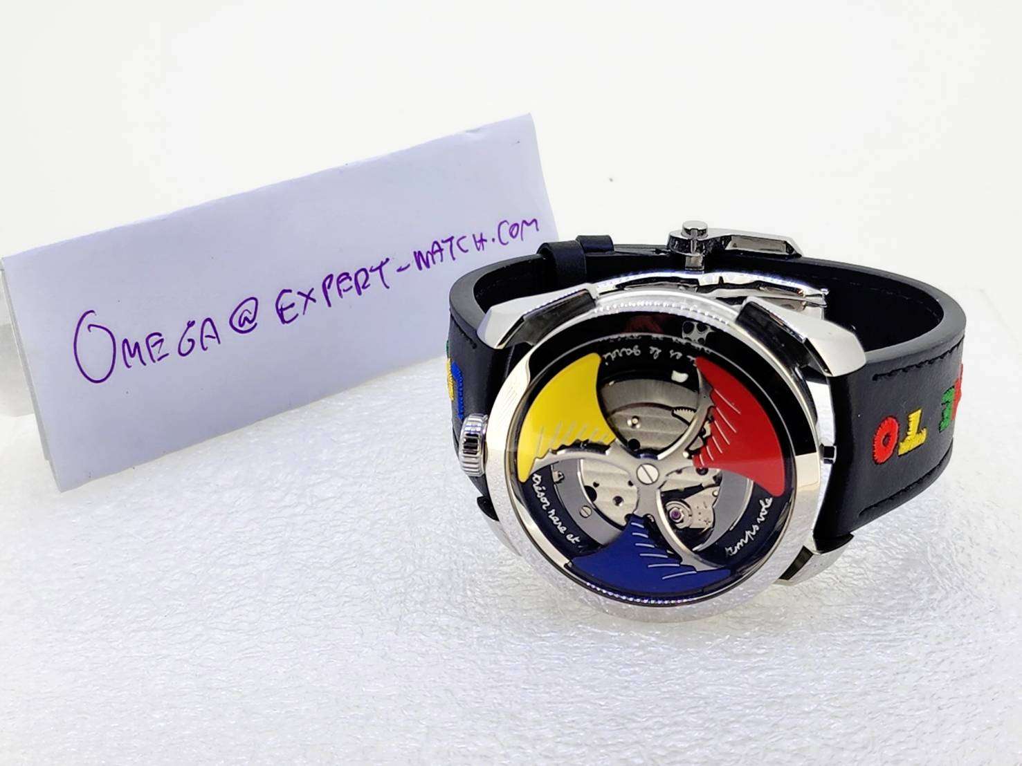 การแสดงเวลาด้วยโรเตอร์สองตัวซ้อนกันสําหรับชั่วโมงสีเขียว และนาทีสีดำ อ่านง่าย ฝาหลังมีแกะสลักลายเซ็นต์ของ Castelbajac ผลิตจำนวนจำกัด 999 เรือนเท่านั้น