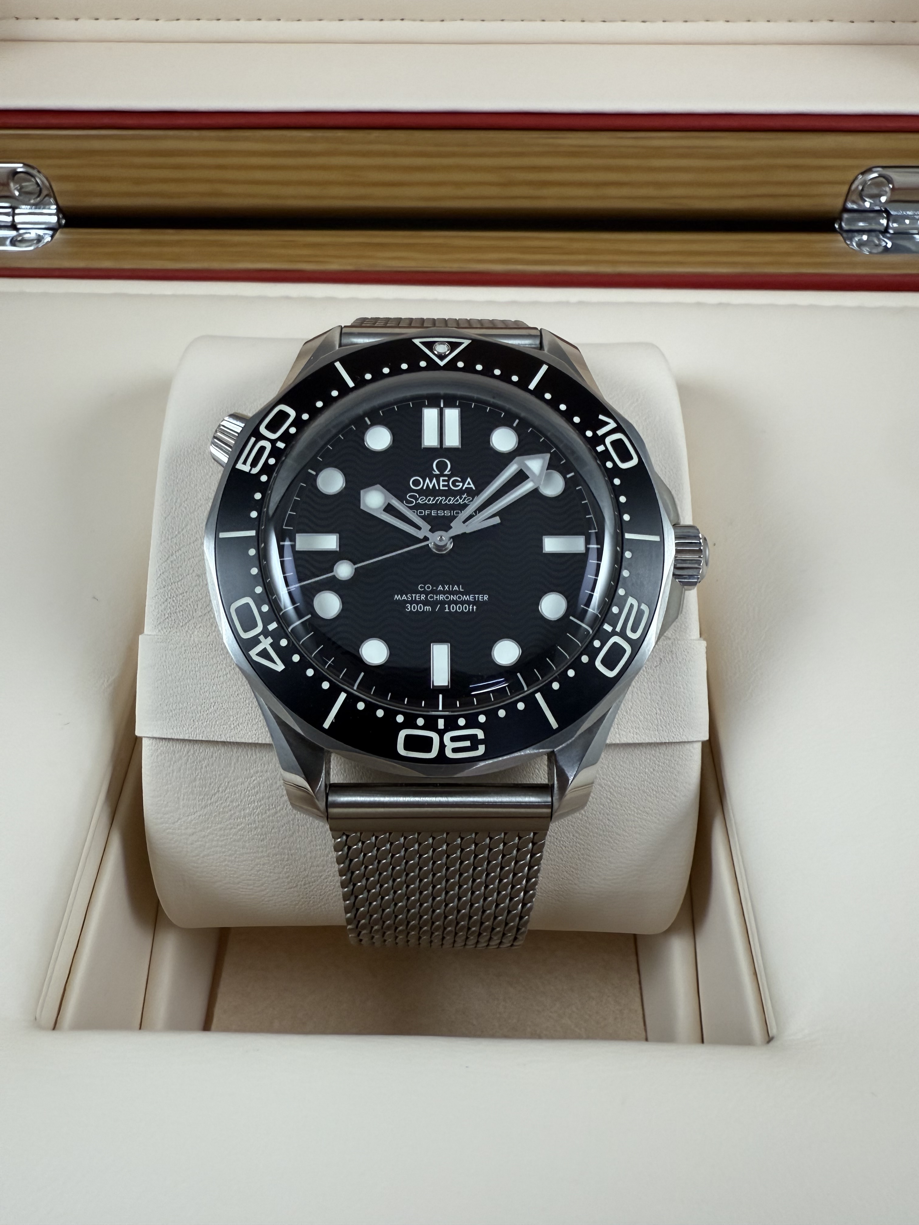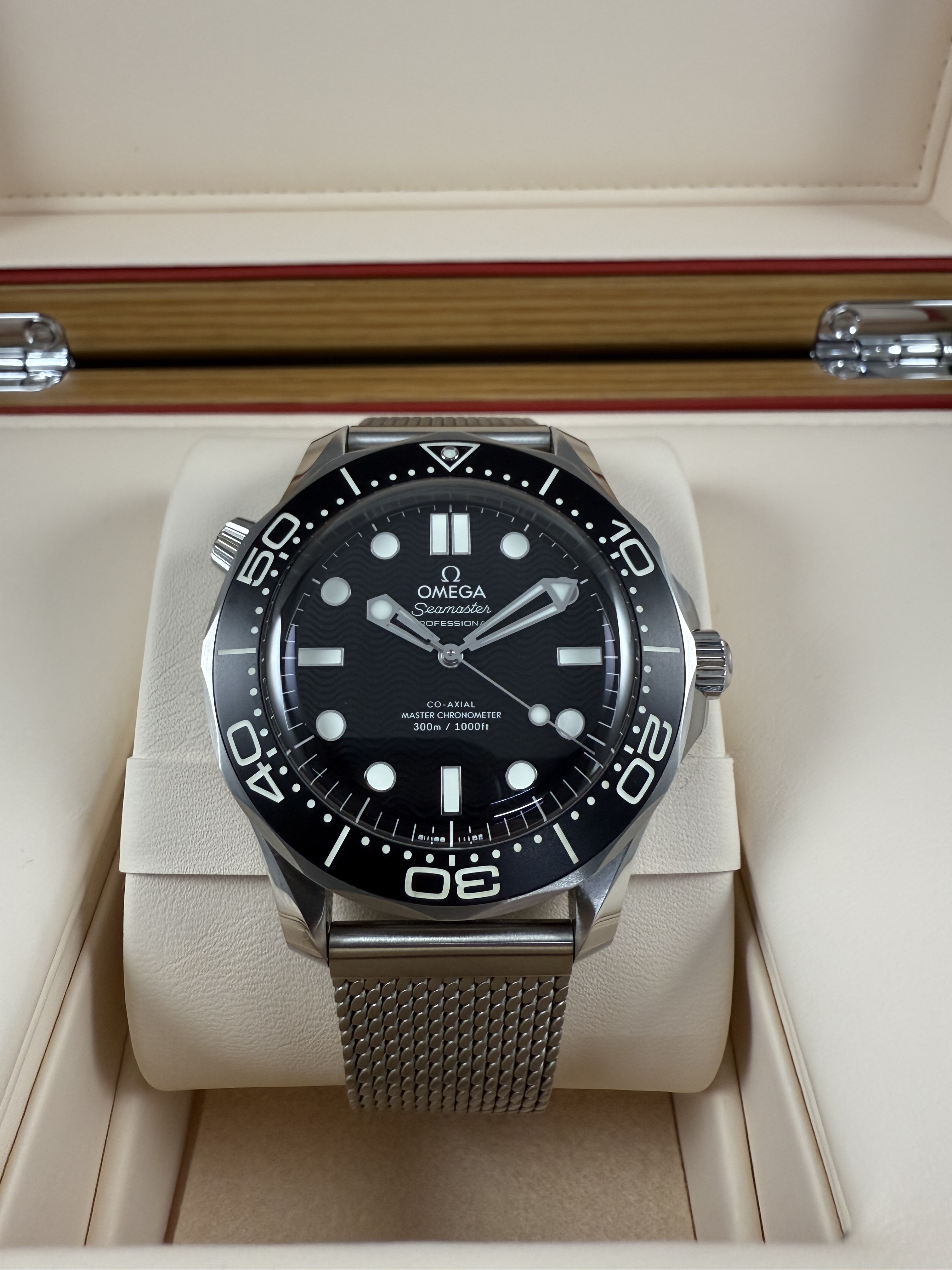 Omega seamaster42 mm รุ่นใหม่ สายถัก มีวงขอบตัวเรือนอะลูมิเนียมอโนไดซ์สีดำพร้อมสเกลดำน้ำบรรจุสารเรืองแสง Super-LumiNova เครื่องรุ่นใหม่ Co-Axial Master Chronometer Calibre 8806 สภาพใหม่มาก ปลายปี24 ออกห้างแพงมาก สวยมาก กล่องใบไทย