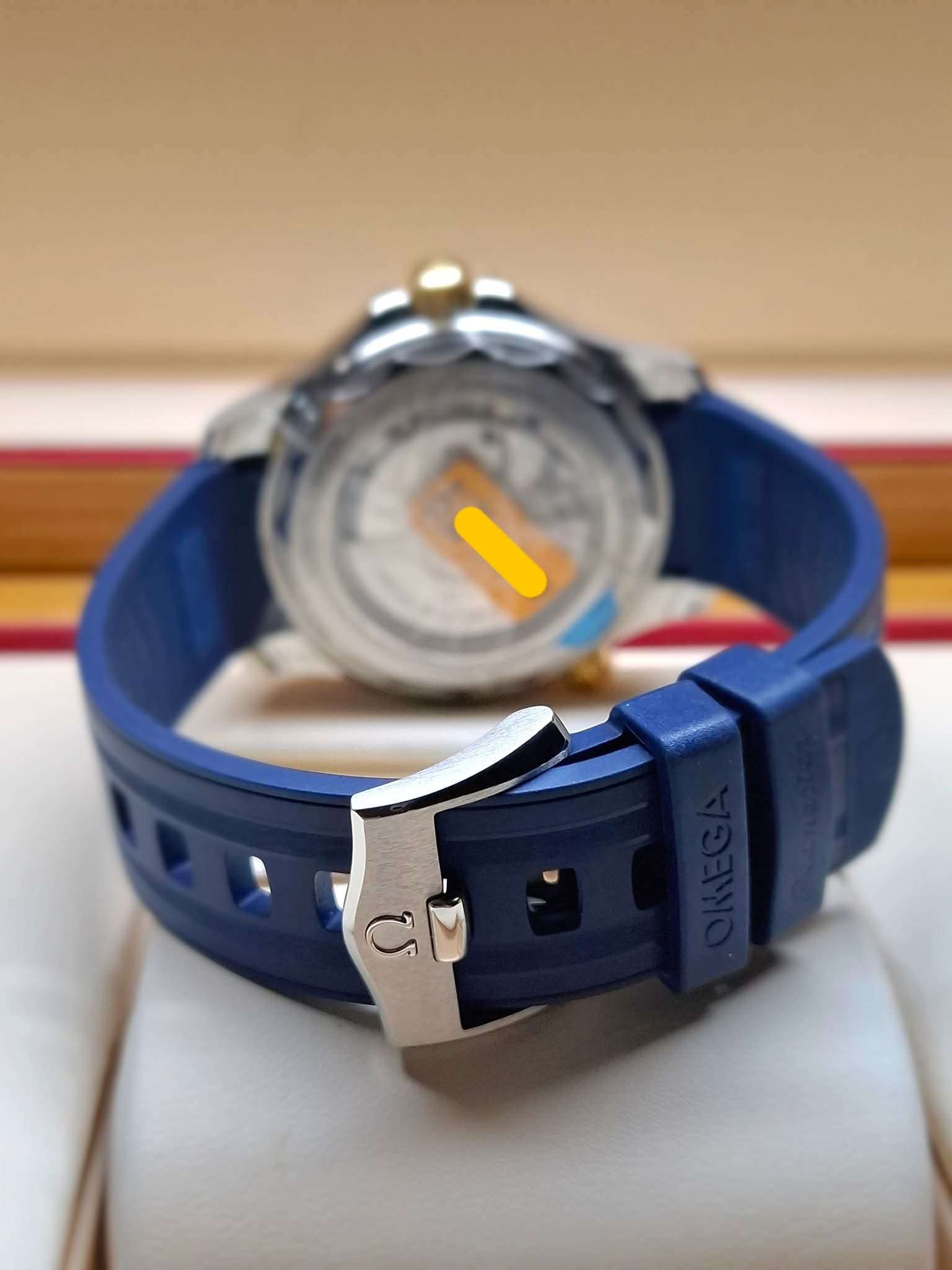 หน้าปัดทำจากเซรามิคสีน้ำเงินลายคลื่น, ตัวเรือนเป็น Steel & Yellow Gold 18K, สายยางสีน้ำเงิน, ระบบ Automatic Calibre Omega 8800, มาตรฐานความเที่ยงตรง Co-Axial Master Chronometer, ป้องกันสนามแม่เหล็ก, ดำน้ำลึก 300 เมตร, มีฮีเลี่ยมวาวล์, มีช่องแสดงวันที่