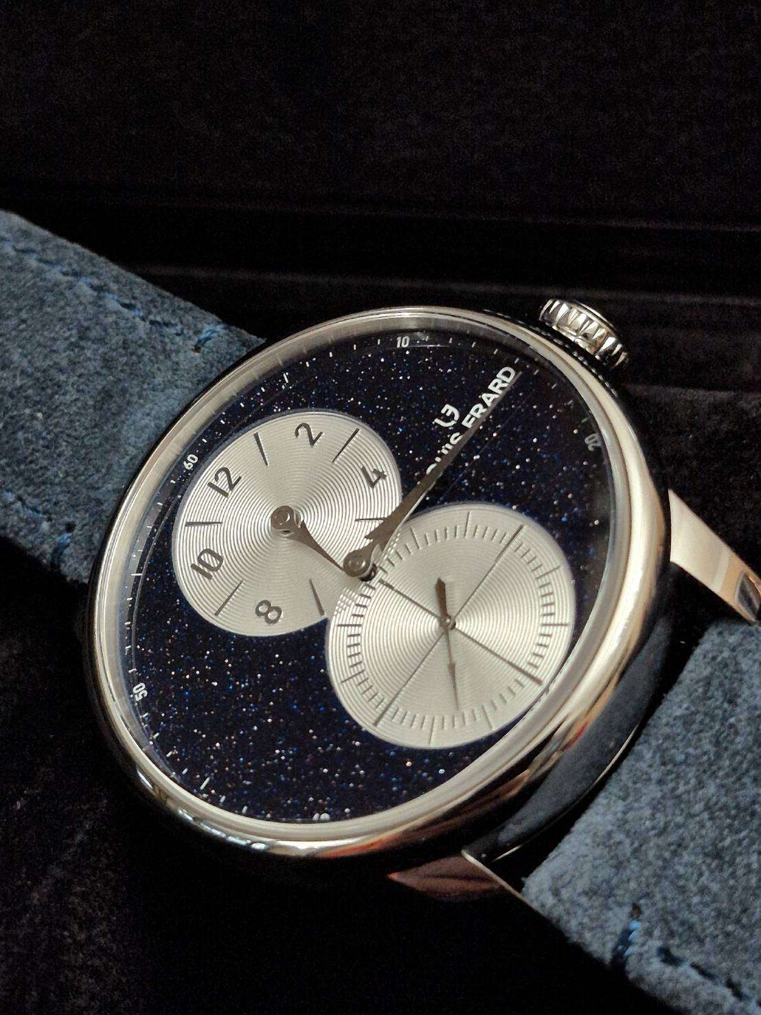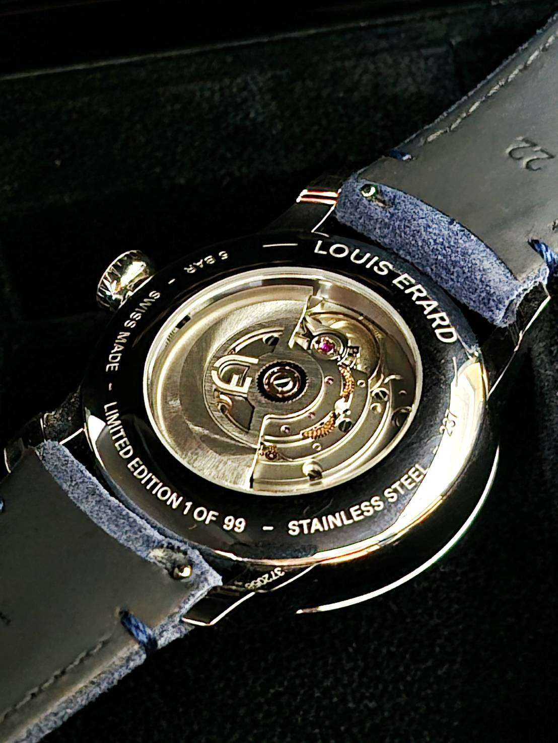 ⌚Louis Erard Excellence Blue Aventurine dial, Limited Edition ผลิตเพียง 99 เรือนทั่วโลก หน้าปัดผลิตจาก ผลึกอเวนจูรีนสีน้ำเงินเปล่งประกายสวยงามทุกมุมมอง บอกเวลาแบบ Regulator เข็มชั่วโมง, นาที และวินาที แยกอิสระจากกัน ในตัวเรือนสตีลขนาด 42 mm กลไก Automatic Sellita Caliber SW266-1 สภาพสวยงามเหมือนใหม่ สาย Blue Nubuck เดิม No box&paper ออกใหม่แสนกว่าบาทเรือนนี้ราคาดี หายาก