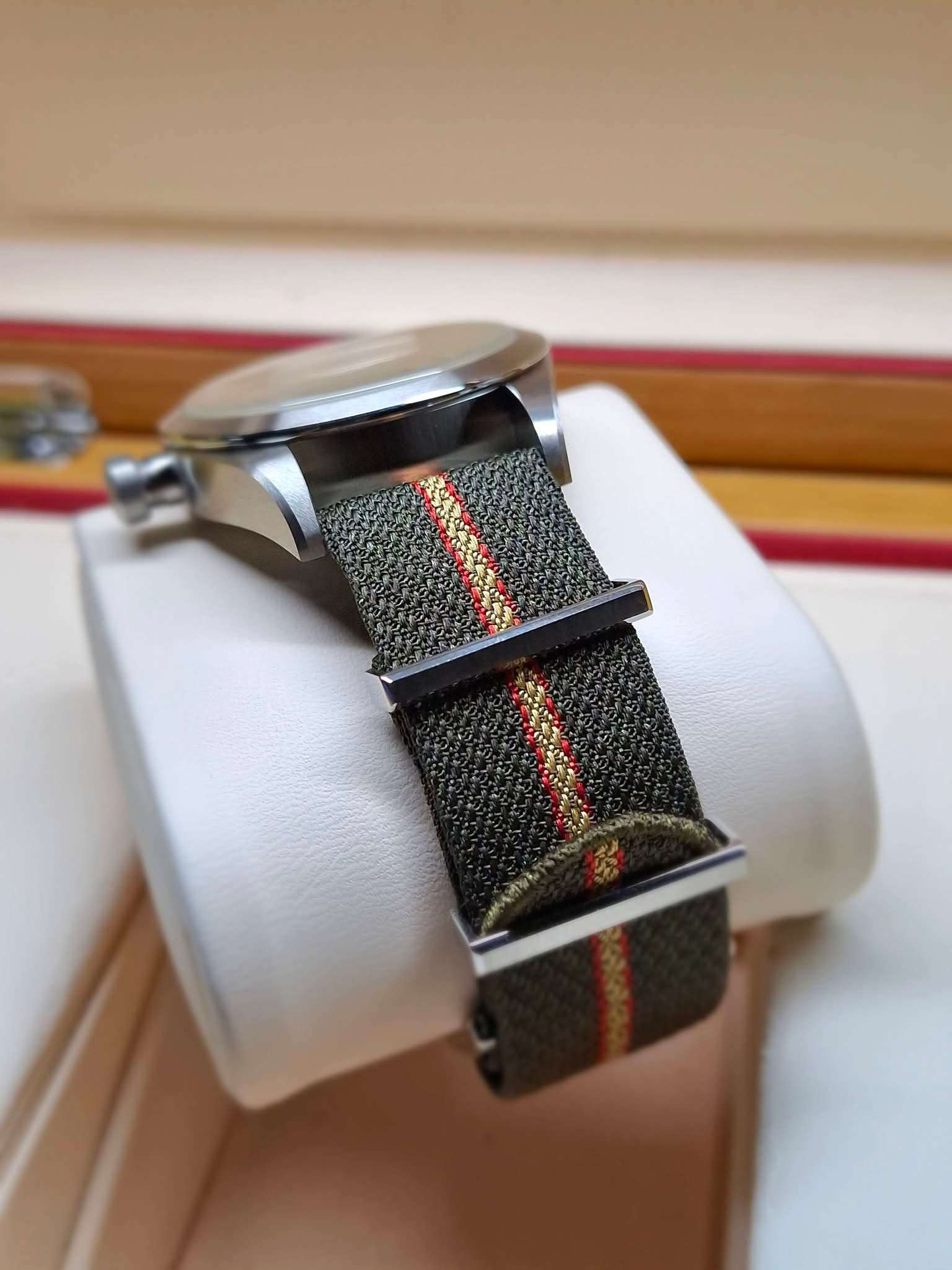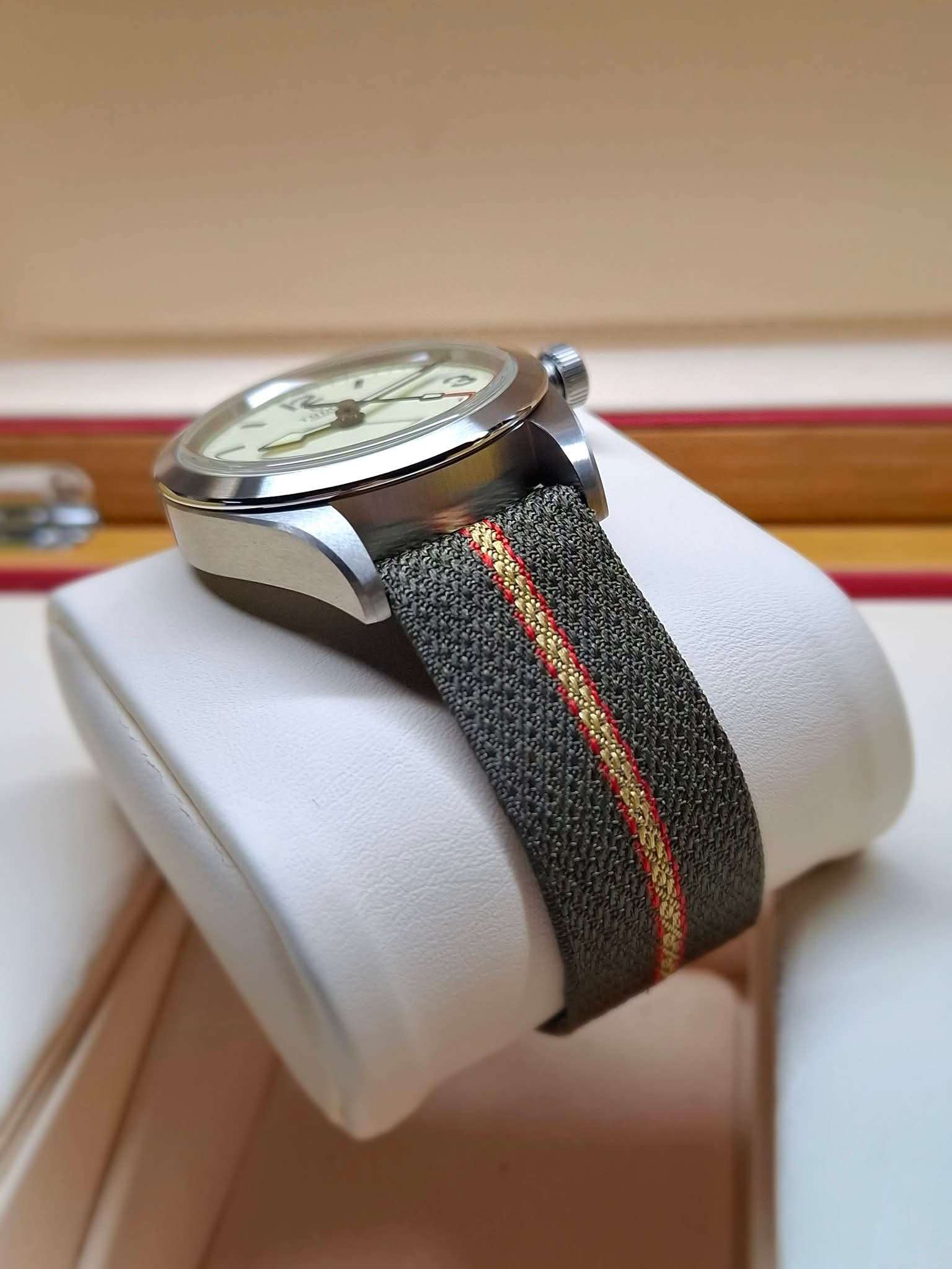 ⌚ เรือนนี้เป็นรุ่นใหม่ สีใหม่ล่าสุด ขนาด 36 มิลใส่ได้ทั้งผู้ชายและผู้หญิง, หน้าปัดสีเบจ Beige, ระบบ Automatic Manufacture Calibre MT5402 (COSC) สำรองพลังงานสูงสุดได้ประมาณ 70 ชั่วโมง, กระจกทรงโดมซัฟไฟร์กันรอย, กันน้ำ 100 เมตร, สายผ้าสีเขียวตัดด้วยลายเส้นสีแดงกับสีเบจพร้อมบัคเคิ้ล