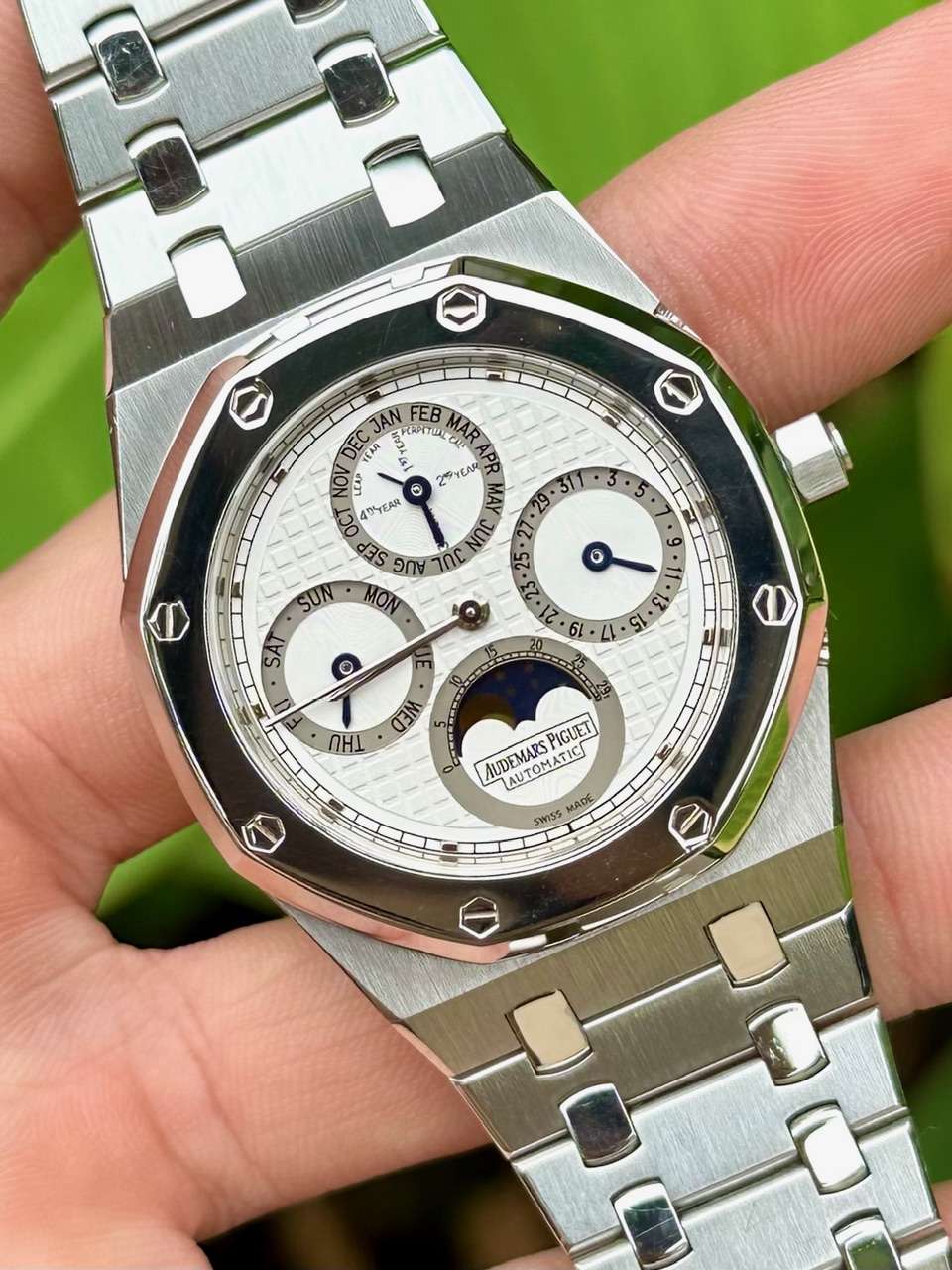 รุ่น Royal Oak Perpetual Calendar ขนาด 39mm ที่รวมความคลาสสิกของดีไซน์ Royal Oak เข้ากับหนึ่งในกลไกชั้นสูงของ Audemars Piguet ได้อย่างลงตัว ถือเป็นหนึ่งในรุ่น QP ที่สง่างามและเป็นที่ต้องการของนักสะสม