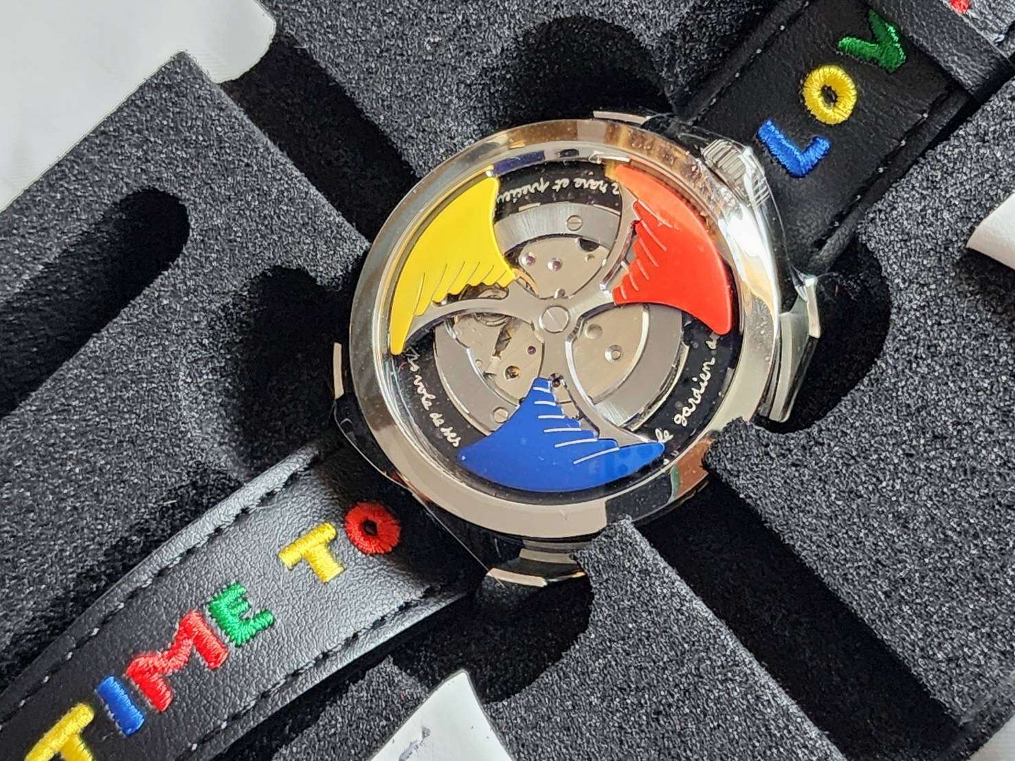 การแสดงเวลาด้วยโรเตอร์สองตัวซ้อนกันสําหรับชั่วโมงสีเขียว และนาทีสีดำ อ่านง่าย ฝาหลังมีแกะสลักลายเซ็นต์ของ Castelbajac ผลิตจำนวนจำกัด 999 เรือนเท่านั้น