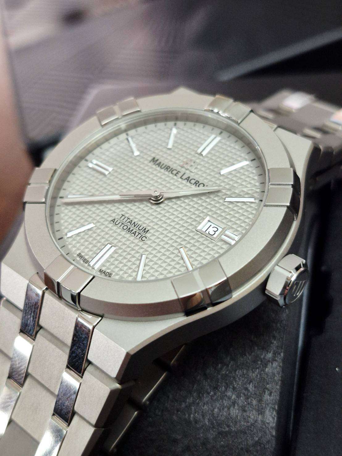 ⌚Maurice Lacroix​ Aikon​ Automatic​ 42mm​ "TITANIUM" รุ่นล่าสุด ตัวเรือนและสายผลิตจากไททาเนียม​น้ำหนัก​เบาหวิว พ่นทรายสลับขัดเงาสวยงามมาก หน้าปัด​ Ti Grey สลักลาย clous de paris สีใหม่อันเป็น​เอกลักษณ์เฉพาะ​ของรุ่นไททาเนียม​เท่านั้น กลไก Caliber​ ML115 26 jewels อัตโนมัติ Power reserve 38 ชั่วโมง เดินด้วยความถี่28,800 vph