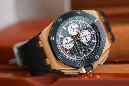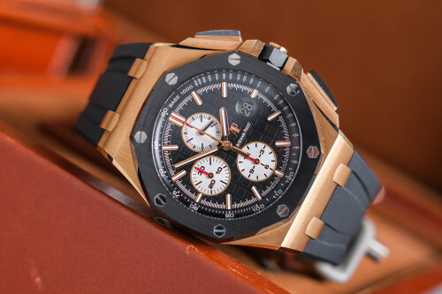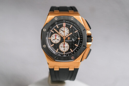 ขนาด 44mm หน้าปัด Black Dial สปอร์ตเต็มข้อ สวยหรูแต่แฝงไปด้วยความดุดัน ตัวเรือนทอง 18K Rose Gold ตัดกับขอบ Ceramic สีดำ เครื่อง AP Automatic ฟังก์ชั่น Chronograph จับเวลานุ่มมือ มาพร้อมสายยางสภาพดีเยี่ยม