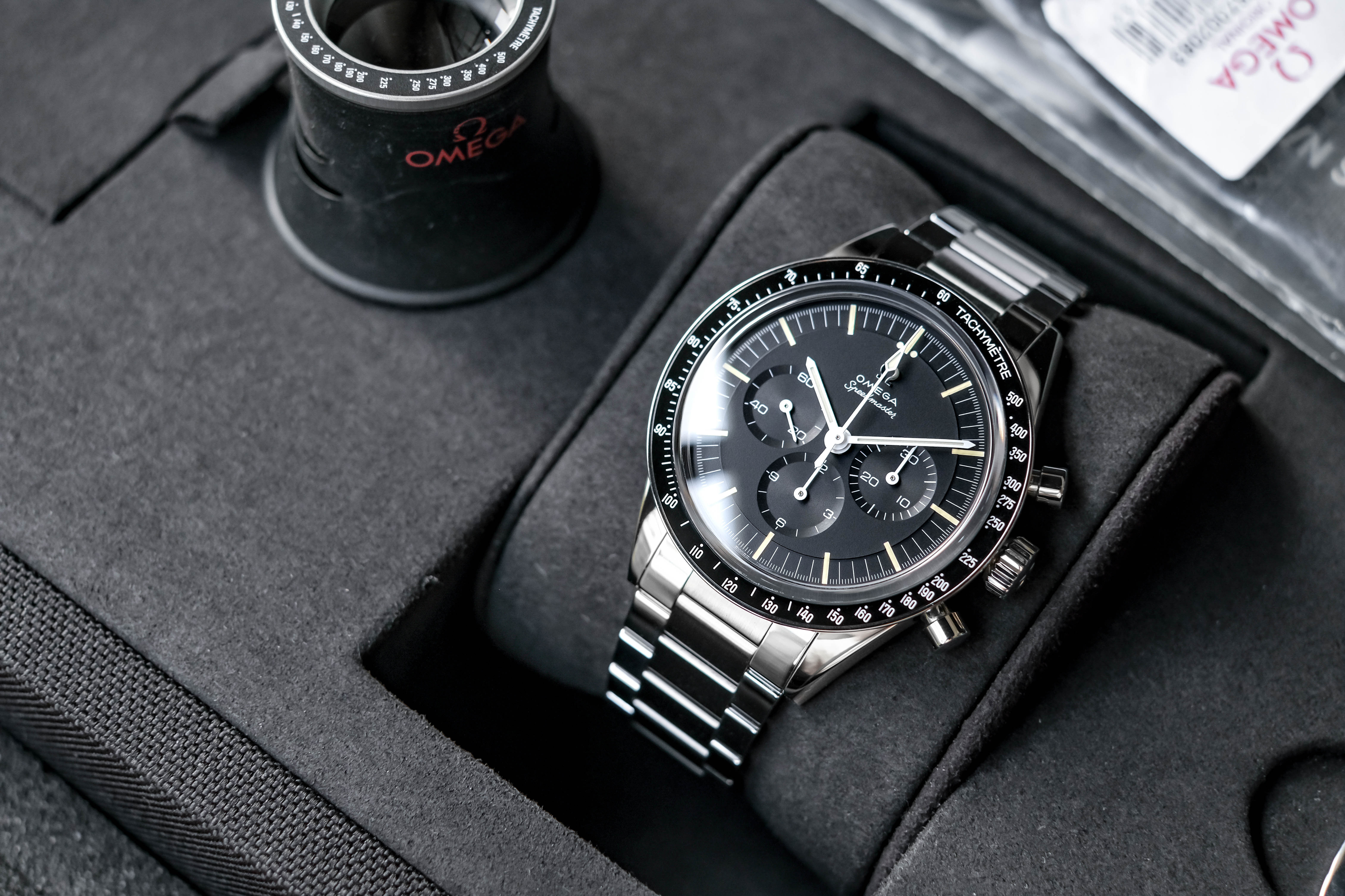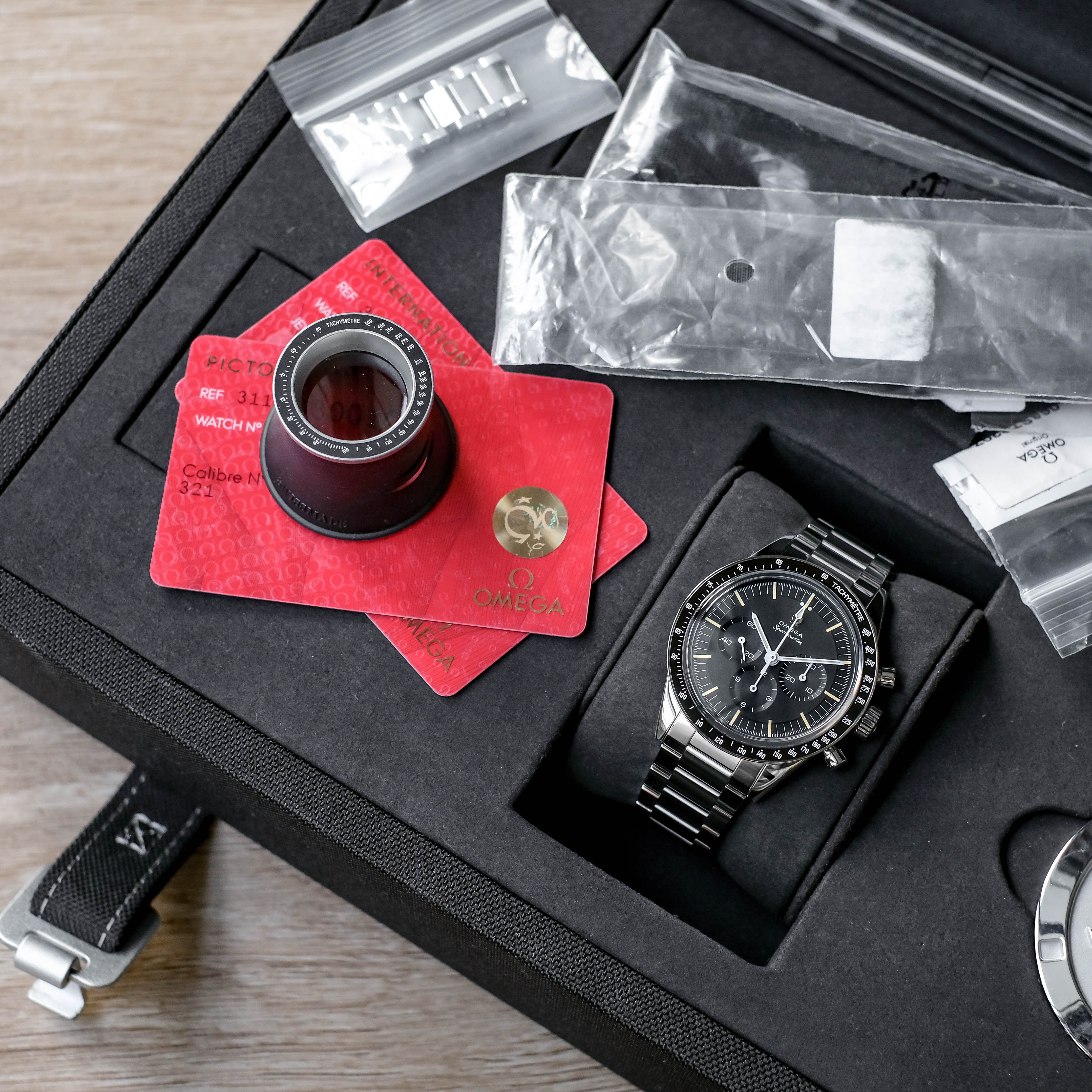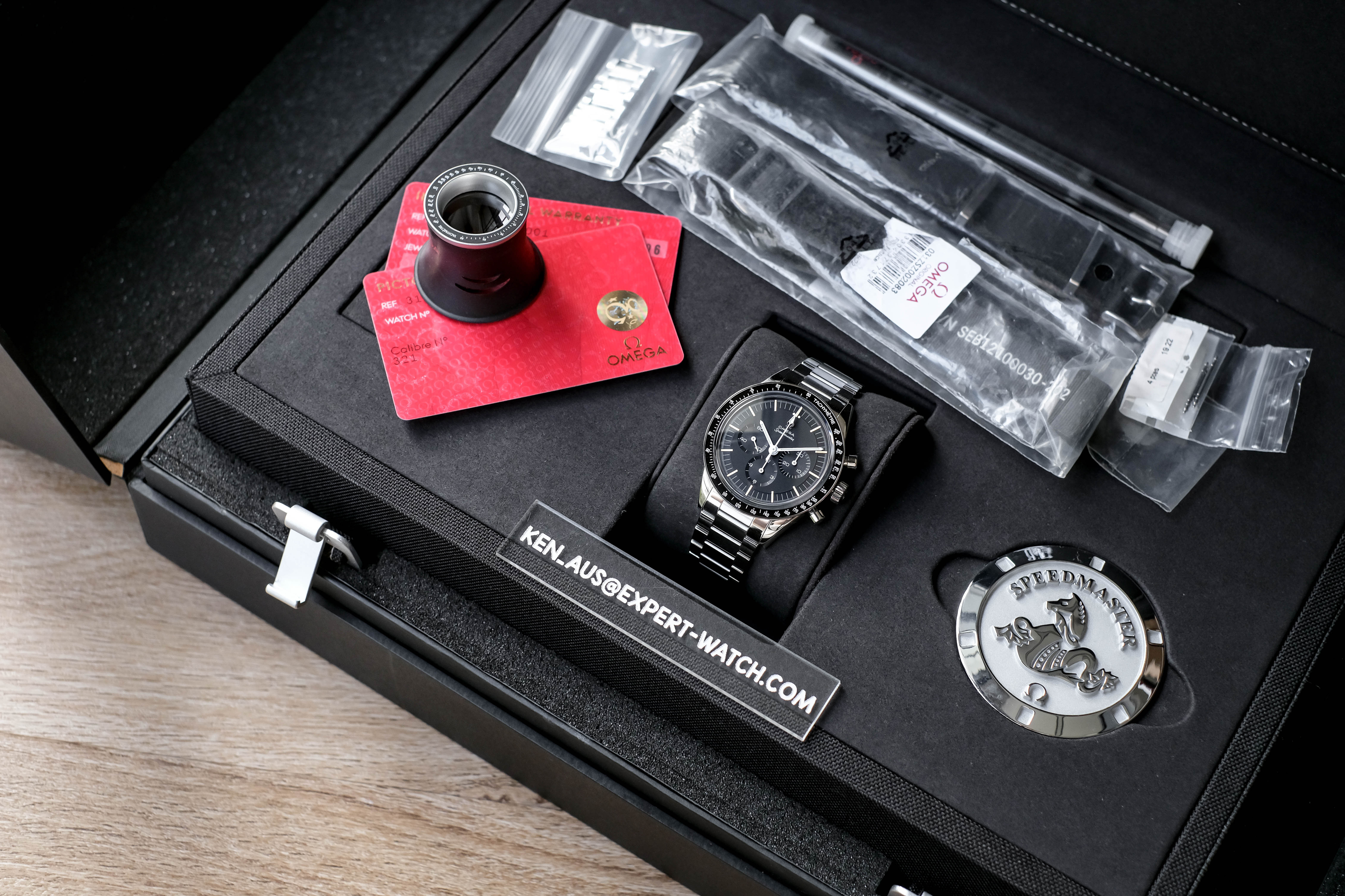 อุปกรณ์ : กล่อง / ใบประกัน(2024) / Pictograms / สายนาโต้2เส้น / ไขควง / Loupe / สปริงบาร์ / เหรียญ / คู่มือ