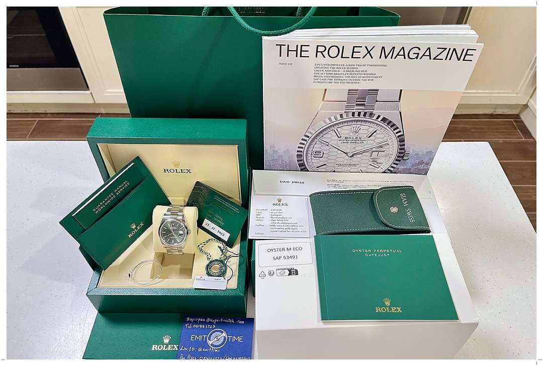อุปกรณ์ Full-Set ขั้นสุดยันใบเสร็จตัวจริง! กล่องเขียวรุ่นใหม่ 3 ชั้น ข้อครบถ้วน คู่มือ x 2 ซองหนัง เหรียญเขียว Warranty Card ใบไทย Siam Swiss ลงวันนี้ 17-Nov-2025 ครบยันป้ายแทกขาว ถุง Rolex ซอง Travel จาก Siam Swiss และ Catalog Rolex ฉบับล่าสุด