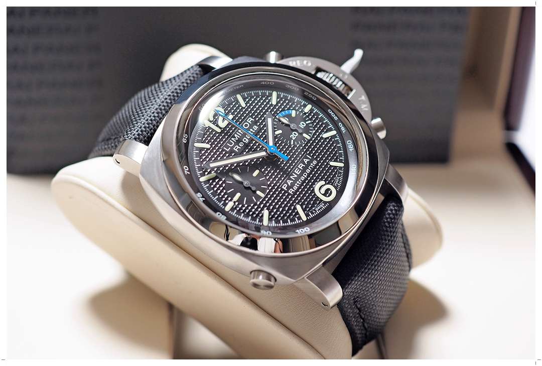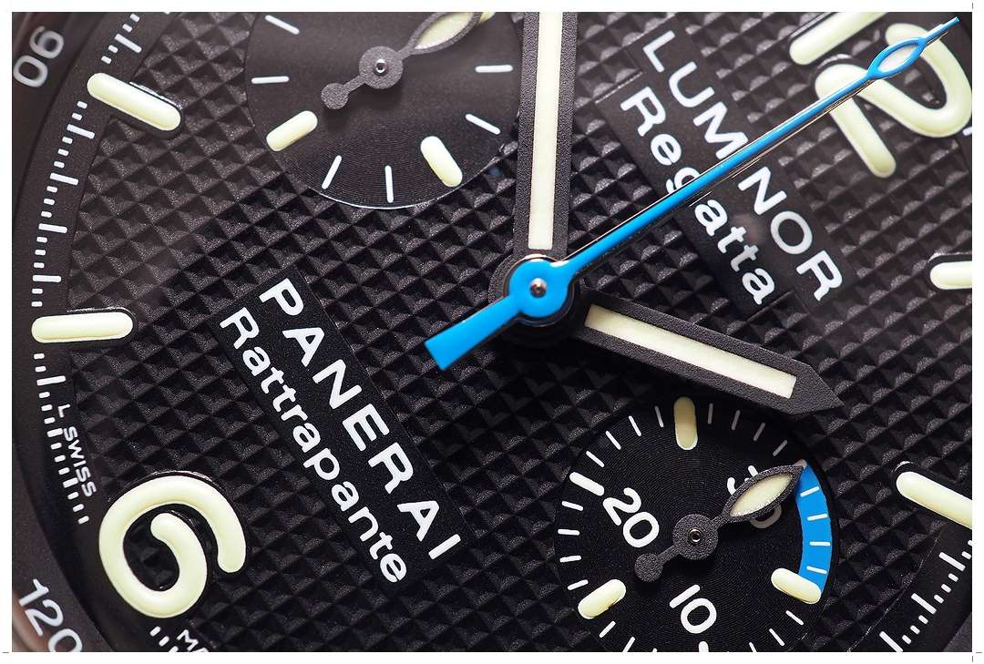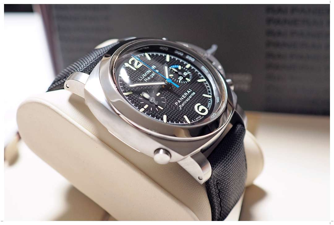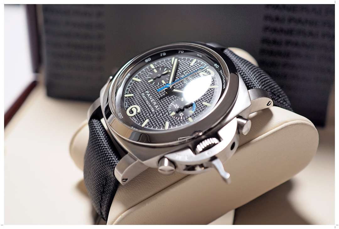 PAM Luminor เรือนนี้มาด้วยขนาด 44mm พร้อมด้วยฟังค์ชั่น Rattrapante Chronograph ที่วาง Layout ได้อย่างลงตัวสวยงาม พรายน้ำสว่างสดใส ตัวถังทรง 1950 ขัดด้านพร้อมขอบ Bezel เงา เข้ากันอย่างลงตัว หน้าฉลุลายวาฟเฟิล (Hobnail) อย่างโดดเด่น ไปได้กับทุกชุดทุกโอกาส หน้าปัดดำจับคู่กับสายได้ลงตัวถึงขีดสุด มาพร้อมบัคเคิ่ลระบบบานพับที่เป็นเอกลักษณ์ประจำตัวของรุ่น ใช้งานได้อย่างง่ายดาย ถือเป็นหนึ่งใน Rare Item ของ Panerai ที่คู่ควรกับการสะสมอย่างแท้จริง