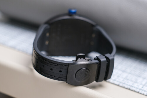 ✨ ขนาด 41mm. ไซส์สปอร์ตเต็มข้อ หน้าปัด Black Dial แกะลายสวย ตัดกับหลักชั่วโมงอารบิคสีน้ำเงิน สวยสปอร์ตลงตัว ช่องวันที่ตรง 6 นาฬิกา ตัวเรือน Titanium รมดำ Black DLC เบาสบายข้อมือมากๆ มาพร้อมสายยางบุด้วยหนังจระเข้สีดำ คุมโทนลงตัวทั้งเรือน