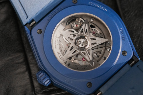 ✨ ขนาด 41mm บางเพียง ~10.75mm ตัวเรือน Blue Cearmic ทั้งเรือน สีสันสะดุดตา น้ำหนักเบา + ทนรอยสูงมาก ใช้งาน daily สบายๆ หน้าปัดแบบ Openworked โชว์โครงสร้างภายในดีไซน์เป็น signature รูปดาวของ Zenith พร้อมเข็มและหลักชั่วโมงเคลือบ Super-LumiNova กันน้ำ 100 เมตร ขับเคลื่อนด้วยเครื่อง In-house Elite 670SK Automatic สำรองพลังงานประมาณ 48–50 ชั่วโมง