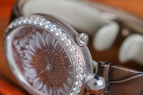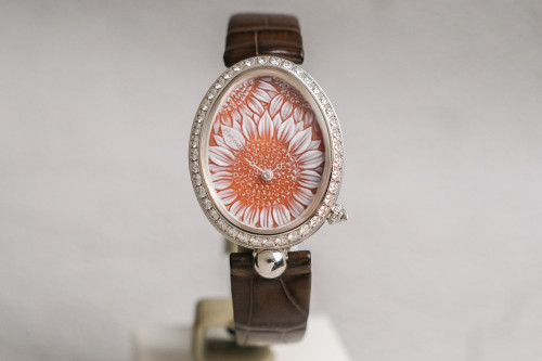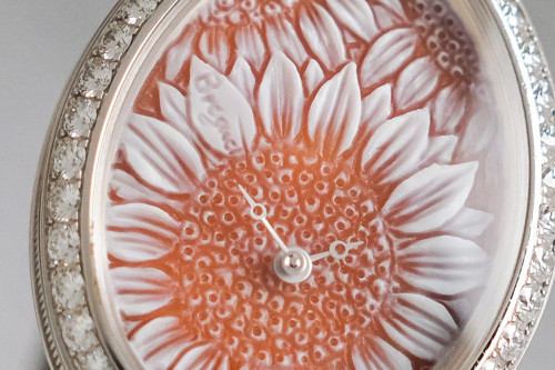 ถ่ายทอดความงามแบบผู้หญิงคลาสสิกได้อย่างสมบูรณ์แบบ ด้วยตัวเรือนทรงไข่ (oval) ขนาดประมาณ 32 x 40 มม. ใน White Gold โดดเด่นด้วยขอบเพชรและหน้าปัดพิเศษ แกะจากเปลือกหอยเป็นลวดลายดอกทานตะวัน แกะด้วยมือ งานประณีตมากๆ ให้มิติแสงเงาอ่อนหวาน และเข็มทรง pomme อันเป็นเอกลักษณ์ ขับเคลื่อนด้วยกลไกอัตโนมัติที่ออกแบบมาเพื่อความสง่างามและสวมใส่สบายในทุกวัน